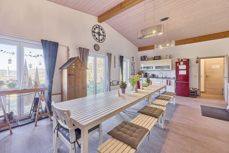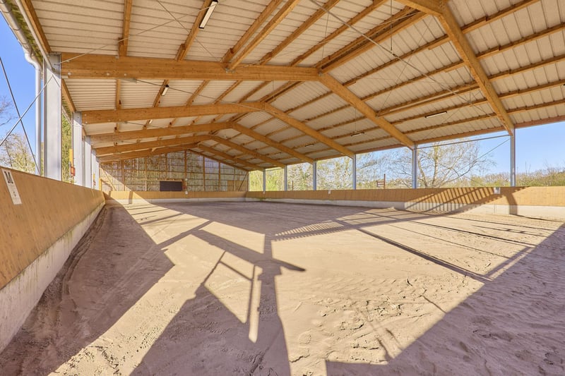 Equestrian Facility in Rhineland-Palatinate Featuring Award-Winning HIT Active Stable, Riding Arena, and Modern Country House! Property Description: This nearly new and thoughtfully designed equestrian estate located in the Donnersbergkreis district of Rhineland-Palatinate offers ideal conditions for horse-friendly living and working in a peaceful, natural setting. The centerpiece of the property is the approximately 6,000 m² HIT Active Stable, which was awarded 7 gold stars by the LAG in 2019. It provides optimal conditions for modern horsekeeping: with covered hay and water stations (heated), a spacious lying hall, sand lunging paddocks, barefoot path, and a continuously mud-free turnout with play and rest areas. Up to 30 horses live here in a mixed herd. For riders, the facility offers numerous well-thought-out amenities: a heated, alarm-secured tack room with a personal locker for each horse, a grooming area with wash bay and solarium, as well as a second outdoor shower, ensuring comfort in daily routines. A cozy rider’s lounge with a kitchenette, fireplace, reading corner, and a sun terrace overlooking the estate invites relaxation or can be used for seminars! Training options include a bright, airy indoor riding arena (dimensions: 20 x 40 m) built in 2022 and a renovated round pen (diameter: 19 m) from 2023. Directly adjacent begins a spacious trail riding area at the edge of the Palatinate Forest, with varied routes suitable for beginners and advanced riders. The entire property spans an impressive 66,409 m² of owned land. Additional leased areas complement the operation perfectly and offer extra flexibility, especially for pasture management. Included in the offering is a modern and efficient single-family home in country house style, built in 2016. It impresses with contemporary architecture, high-quality furnishings, and a cozy living atmosphere—ideal as a private residence or as a main home for the estate operators. Features: Residential House: - Year of construction: 2016 - Kitchen: Country house kitchen from 2016, induction cooktop and gas hob - Heating: Gas condensing boiler, solar thermal system for hot water, underfloor heating, additional fireplace stove - Construction: Timber frame, low-energy house KfW 70 - Windows: Triple-glazed, plastic, sash windows - Flooring: Parquet and tiles - Basement: Not basemented - Garden with sun terrace and covered lounge area - Car parking spaces on the property HIT Active Stable: - Awarded 7 gold stars by the LAG in 2019! - Year of construction: 2016 - Turnout area for horses: approx. 5,600 m² - Number of horses: 30 (including 5 paddock boxes for integration) - Fodder automatic feeder, selection gates, adjacent pasture, multiple covered water and hay stations (heated, with tap water) - Spacious lying hall with adjoining covered manure pad - Several sand lunging arenas, barefoot path with different ground surfaces - Approximately 650 meters of trail riding routes Indoor Riding Arena: - Built in 2022, panoramic design - Riding surface: 20 x 40 meters - Flooring: North Sea sand mixture - Manufacturer: Hörmann (glulam beams, steel) - Sprinkler system available Farm Buildings: - Built in 2016 - Tack room (security door WK 2 with electric lock cylinder) - Covered indoor & outdoor grooming areas and wash bay (hot water) - Large rider’s lounge / seminar room with kitchen and WC, technical room, ceiling storage, feed room Guest Horse Area (beside riding arena): - Built in 2016 - 4 paddock boxes, currently used as an open stable (but originally designed as a separate stable unit with its own tack room) - Ideal for guest horses during training sessions or as a rehabilitation area - Paved open stable area with hay rack Lunge Circle: - Built in 2023 - Diameter: 19 meters - Surface: Wood chips and sand mixture Round Hall: - Built in 2016 - Area: 250 m² / space for approximately 342 round bales - Gravel surface, closed on three sides - Tent hall Additional & Lease Areas: - Salt inhalation tent for 2 horses - Horse blanket dryer - Approximately 1 hectare of leased pasture Location: The equestrian estate is situated in the western part of the Donnersbergkreis district in Rhineland-Palatinate (Wartenberg-Rohrbach), embedded in a natural environment with excellent infrastructural connections. The nearest A63 motorway exit is just a few minutes away, providing quick access to Mainz, Kaiserslautern, and the A6. The nearby train station, connected to the Kaiserslautern–Bad Kreuznach line, ensures good accessibility by train. The area is characterized by an active, well-connected community life. Despite its modest size, the region offers diverse club activities, cultural events, and strong volunteer engagement. From sports clubs and village festivals to seasonal markets—the social fabric is lively and family-oriented. The scenic location in the North Palatinate Mountain Range invites outdoor activities such as hiking, riding, and cycling, offering relaxation right at your doorstep. Close proximity to Kaiserslautern (about 15 minutes by car) combines rural living with urban amenities—including shopping, medical care, cultural offerings, universities, and colleges. For families, the area is particularly attractive: within walking distance are kindergartens, and well-connected primary and secondary schools are nearby. Daily life can be easily managed by car or public transport. Overall, this location offers a harmonious blend of peaceful, natural surroundings, excellent transport links, and a vibrant social environment—ideal for those who enjoy country living while remaining close to urban centers. The exact address will be provided with the exposé. Energy Certificate: Main energy source: Gas, solar thermal Energy consumption certificate End energy demand: 61.91 kWh/(m²*a) Energy efficiency class: B Construction year according to energy certificate: 2016 Additional Information: Unauthorized access to the equestrian estate outside of viewings