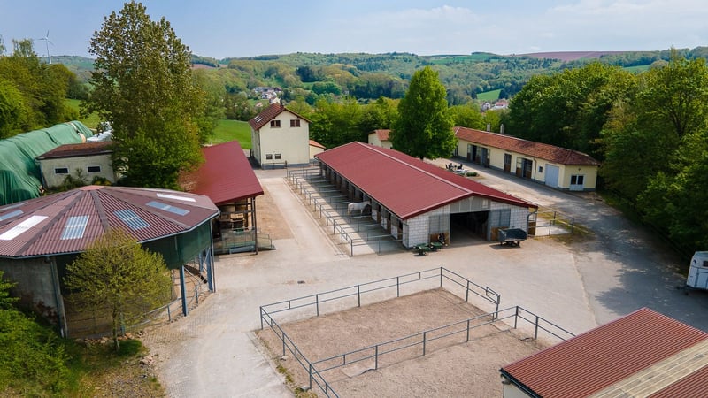 Bitte füllen Sie das nachfolgende Kontaktformular vollständig aus bevor Sie uns telefonisch kontaktieren. Vielen Dank für Ihr Verständnis! Reitanlage im Saarland mit professionellen Trainingsbedingungen und großem Wohnhaus! Objektbeschreibung: Die Reitanlage befindet sich in einem Ortsteil der Stadt St. Wendel im Saarland und umfasst eine Grundstücksgröße von rund 148.811 m² im Eigentum – vollständig am Hof gelegen. Der Betrieb ist derzeit als Pensionsbetrieb ausgelastet und bietet Pferd und Mensch ideale Trainingsbedingungen und eine pferdegerechte Haltungsform. Das Wohnhaus aus dem Jahr 1970 umfasst rund 300 m² Wohnfläche, verteilt auf 3 Etagen plus Keller. In den Jahren 2010 – 2012 wurde nicht nur der Betrieb von einem ehemaligen Milchviehbetrieb zur Pferdepension, sondern auch das Wohnhaus bekam einen neuen Charakter. Heute finden Sie moderne und helle Wohnräume wieder, einen einladenden Wintergarten und freie Sicht über die Reitanlage. Das Haus wird über eine Flüssiggas-Heizung aus 2010 beheizt, verfügt über Öfen und Doppelverglasung aus 1996. Die Reitanlage wird im Herzstück aus einem modernen und gut belüfteten Stallgebäude gebildet, hier befinden sich 24 Paddockboxen (Maße 3 x 4 Meter) zzgl. angrenzendem Paddock. Ein seperates Gebäude umfasst Laufställe für bis zu 8 Pferde mit Sand-Auslauf. Das Wirtschaftsgebäude aus 1994 – 1996 umfasst neben beheizten Sattelkammern, Kunden-WC’s, Umkleiden und Reiterstube auch mehrere Putz- und Waschplätze sowie eine Futterkammer. Zwei Bergehallen ermöglichen die Lagerung von 400 Rundballen, während die Mistentsorgung über eine große Mistplatte erfolgt. Für das tägliche Training bietet die Immobilie eine Führmaschine für 4 Pferde, eine Longierhalle (15 Meter Durchmesser), eine Reithalle aus 1993 mit den Maßen 19 x 42 Meter und einen traumhaften Dressurplatz aus 2012 mit einem Ebbe-Flut-System & den Maßen 20 x 60 Meter. Die im Eigentum befindlichen knapp 15 ha Weidefläche am Hof bieten beste Futtergrundlage, aber natürlich auch wunderbare Ausläufe für die Pferde. Auch hier befinden sich Selbsttränken, für entspanntere betriebliche Abläufe. Die Reitanlage vereint ideale Trainingsbedingungen, auch für den hohen Sport, mit dem Charme der Alleinlage und atemberaubenden Grundstücksflächen! Ausstattung: Wohnhaus: - Baujahr: 1970, Dachgeschoss 1992, Wintergarten EG 1995 - Wohnfläche: ca. 300 m² zzgl. Nutzflächen - Heizung: Flüssiggas aus 2010, Öfen in EG und DG (Heizungsrohre aus 1970) - Fenster: Kunststoff, Doppelverglasung aus 1996 - Modernisierung: 2010 – 2012 gesamtes Haus (Küche EG aus 2012 Marke Alno) Stallgebäude: - Baujahr Gebäude 2010 - 24 Paddockboxen, Maße 3 x 4 Meter plus Paddock - Hersteller: DS Stahl, Interieur von MBH Stahlbau Henkel - Dach: Trapezblech mit 40 mm Dämmung Laufställe: - Separates Gebäude - Laufställe für 8 Pferde mit angrenzenden Sand-Paddocks Wirtschaftsgebäude: - Baujahr: Ursprung 1994 für den ersten Teil als Lager, 1995 Erweiterung als Milchabfüllstation des damaligen Betriebes, 1996 Anbau von Lager- und Sozialräumen - Reiterstube / Sozialbereich für Einstaller mit rund 100 m² - Putzplätze mit Gummi-Matten, Solarium - Waschplatz mit Warmwasser - Futterkammer - Beheizte Sattelkammern, Kunden WC, Umkleidebereiche Reithalle: - Baujahr 1993 - Reitmaß ca. 19 x 42 Meter - Boden: Reitsand Vlies (Columbus Professional Horse Equipment) - Schöppler-Beregnungsanlage vorhanden - Reithallenbande “Safety Wall” - Dach: Wellplatten (asbestfrei) - Konstruktion: Stahl, Lochblech an den Seiten Dressurplatz: - Baujahr 2012 - Reitmaß 20 x 60 Meter - Boden: Reitsand (Columbus Professional Horse Equipment), Ebbe-Flut-System - Einfriedung mit weißem Zaun Führmaschine: - Baujahr 2010 - Pferdeanzahl: 4 - Boden: Beton - Überdachung - Hersteller: MBH Henkel Longierhalle: - Baujahr 2013 - Durchmesser 15 Meter - Boden: Reitsand - Beregnungsanlage Heulager - Zwei Hallen mit insgesamt 300 m² Bruttogrundfläche - Boden: Beton - Überdachung mit Trapezblech, 3 Seiten offen Weiteres: - Werkstatt - Mistplatte zur Festmistlagerung - Sandpaddocks und Koppeln am Hof Lage: Die Reitanlage befindet sich in einem Ortsteil des Gemeindebezirks der Stadt St. Wendel im Landkreis St. Wendel im Saarland. Mit dem Auto besteht eine schnelle Anbindung an die Bundesstraße B41 und damit an die Region Richtung Saarbrücken und Neunkirchen. Die nächsten Autobahnen sind die A62 (Anschlussstelle Freisen) und die A1 (Anschlussstellen Tholey oder Illingen) in gut erreichbarer Entfernung mit dem Auto. Über das Straßennetz von St. Wendel ist man in etwa 15–25 Minuten an einer Auffahrt. Der öffentliche Nahverkehr erfolgt hauptsächlich über Buslinien nach St. Wendel, wo es auch einen Bahnanschluss gibt. St. Wendel überzeugt durch eine hervorragende Infrastruktur und eine hohe Lebensqualität, die sowohl für Familien als auch für Singles attraktiv ist. Die Stadt bietet eine breite Auswahl an Schulen aller Bildungsstufen, von Grundschulen über Realschulen bis hin zu Gymnasien, sowie vielfältige Möglichkeiten der Ganztagsbetreuung. Für die jüngsten Bewohner stehen zahlreiche Kindertagesstätten und Kitas zur Verfügung, die eine flexible Betreuung ermöglichen. Die medizinische Versorgung ist ausgezeichnet. Neben einem Krankenhaus gibt es zahlreiche Haus- und Fachärzte sowie Apotheken, die eine schnelle und unkomplizierte Gesundheitsversorgung sicherstellen. Einkaufsmöglichkeiten für den täglichen Bedarf, darunter Supermärkte, Fachgeschäfte, Bäckereien und Märkte, sind zentral gelegen und leicht erreichbar. Die Innenstadt lädt zudem mit Restaurants, Cafés und kulturellen Angeboten zum Verweilen ein. Freizeitmöglichkeiten werden in St. Wendel großgeschrieben: Parks, Grünflächen, Sportvereine sowie Rad- und Wanderwege sorgen für ein aktives Leben im Grünen. Zahlreiche Veranstaltungen, Märkte und Feste stärken das Gemeinschaftsleben und verleihen der Stadt einen leben