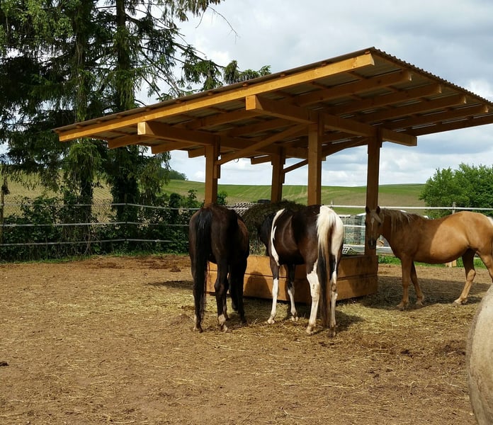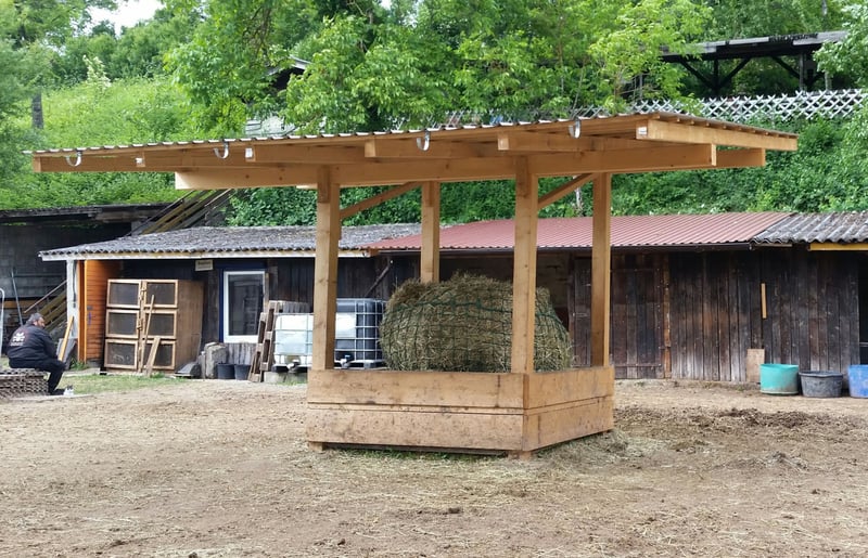 Wegen Aufgabe der Pferdhaltung verkaufen wir unsere selbstgebaute massive Heuraufe von unserem Offenstall. Gebaut ist die Raufe aus dicken Massivholzpfosten und massiven Brettern, sie steht seit 3 Jahren absolut stabil und selbst bei heftigem Sturm hatten wir nie Probleme. Das Dach ist aus Trapezblechplatten und alles an der Raufe ist solide verschraubt und nicht genagelt. Somit kann sie gut ab- und wieder aufgebaut werden. Die Raufe bietet 6-8 Pferden genug Platz zum Fressen und durch die großzügige Überdachung stehen sie geschützt vor Regen und Schnee. Wir haben sie immer mit 1,40-1,50m Rundballen gefüllt und ein Heunetz mit Ring drübergezogen. Platz bietet die Raufe aber auch für 1,8m gr. Ballen. Für ein leichteres befüllen kann die Raufe an einer Seite geöffnet werden. Allein die Materialkosten übersteigen bei weitem den Verkaufspreis.