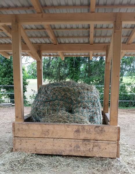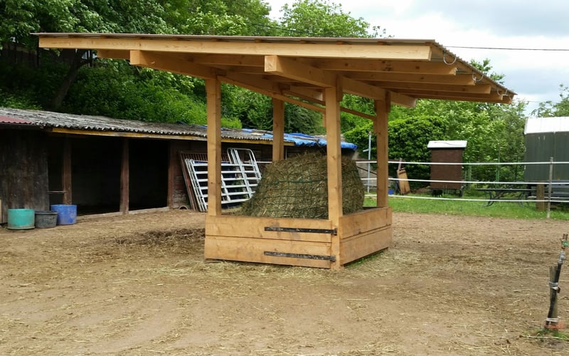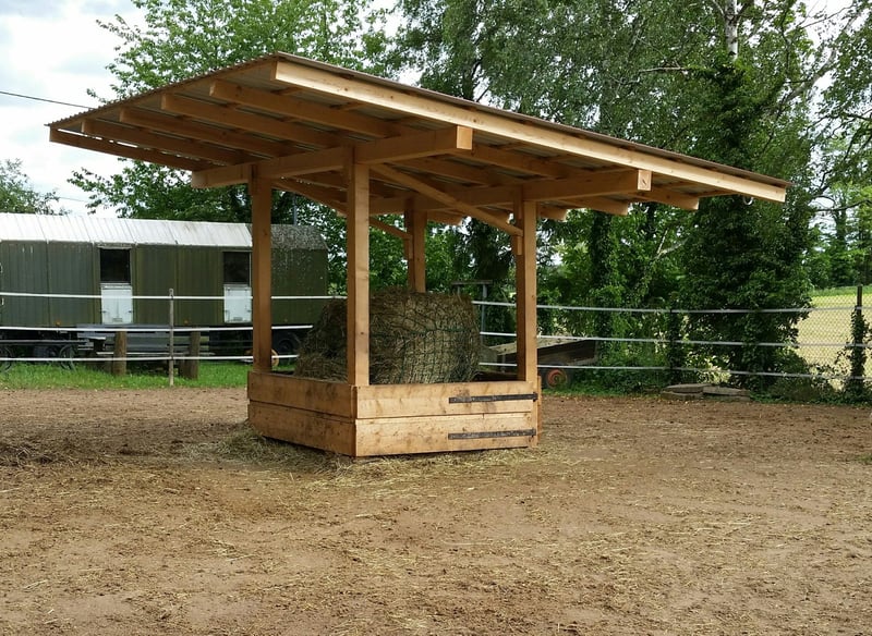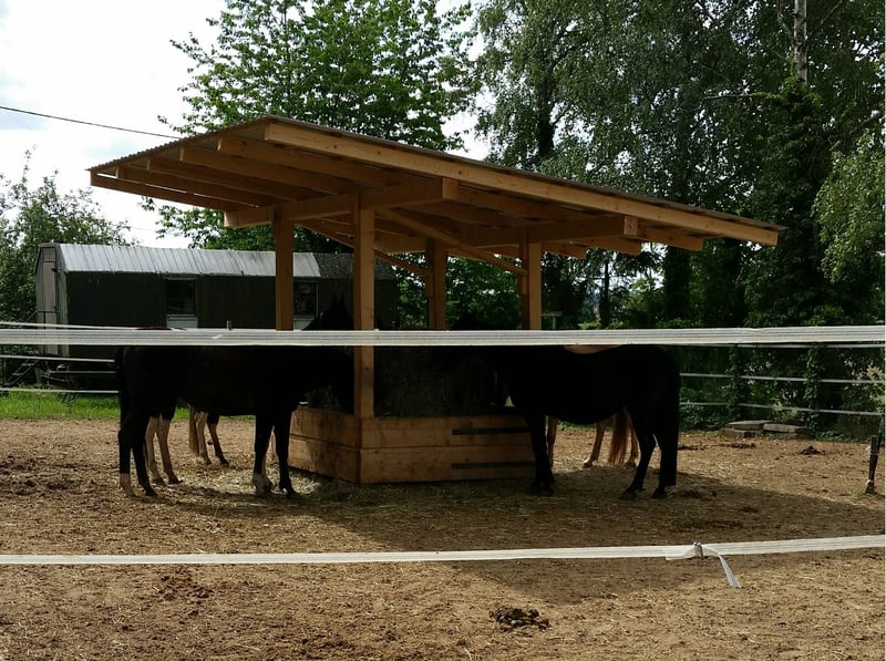 Wysokiej jakości karmnik dla koni o wymiarach 2 x 2 m, wykonany z litego drewna, niezwykle stabilny,
