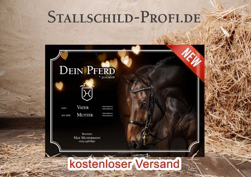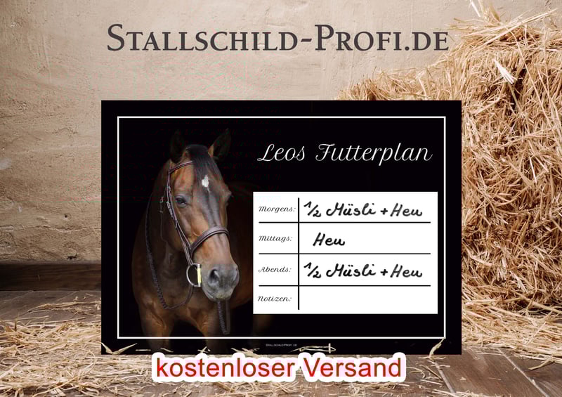 Gib der Pferdebox deines Lieblings eine persönliche Note mit einem individuell gestalteten Boxenschild. Bei Stallschild-Profi.de kannst du dein Schild ganz nach deinen Wünschen erstellen – mit eigenem Foto, Pferdenamen, Geburtsdatum, Abstammung, Stallnamen oder einem persönlichen Spruch. Wähle aus verschiedenen Designs, Schriftarten und hochwertigen Materialien wie Forex-Kunststoff, Hart-PVC, Alu-Dibond oder Acrylglas. So entsteht ein einzigartiges Namensschild für die Pferdebox, das nicht nur dekorativ ist, sondern auch wichtige Informationen über dein Pferd stilvoll präsentiert. Unsere Boxenschilder sind robust, wetterfest und perfekt für Stall, Reitanlage oder Turnierstall geeignet. ✔ Individuell gestaltbar mit Foto und Text ✔ Hochwertige, langlebige Materialien ✔ Verschiedene Größen und Designs ✔ Ideal für Stall, Pferdebox und Reitanlage ✔ Versandkostenfrei innerhalb Deutschlands Gestalte jetzt dein persönliches Boxenschild für dein Pferd ganz einfach online. 👉 www.stallschild-profi.de