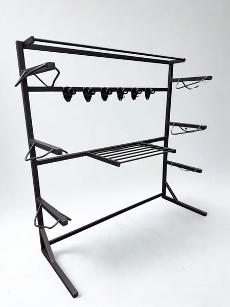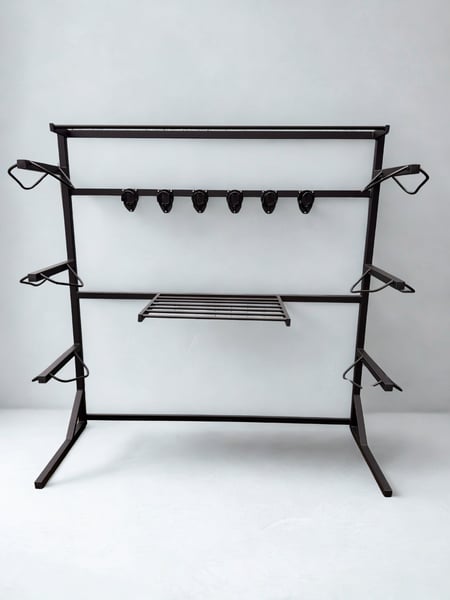 Stalowa ścianka siodlarniana. Praktyczna i estetyczna ścianka siodlarniana, wykonana z wysokiej jakości stali malowanej proszkowo. To niezastąpiony element wyposażenia każdej profesjonalnej siodlarni. Pomieści: • do 6 siodeł • do 6 ogłowi • do 6 czapraków • 1–3 derki (na górnej półce) Wymiary: 182x200x66 cm Zalety: • Solidna, stabilna konstrukcja stalowa • Starannie wykonane spawy i wykończenia • Malowanie proszkowe zapewnia odporność na wilgoć i uszkodzenia mechaniczne • Ergonomiczny układ uchwytów – szybki dostęp i dobra organizacja sprzętu Idealna do stajni sportowych, rekreacyjnych oraz prywatnych. Doskonale sprawdzi się zarówno wewnątrz, jak i w dobrze zadaszonych pomieszczeniach gospodarczych. Prezentowana ścianka jest standardem. Możemy dla Państwa wykonać podobną, jednak według Państwa projektu - w innych wymiarach, na kółkach, bez nóżek (do przykręcenia do ściany), w innym kolorze. Czas realizacji zamówienia: do 7 dni roboczych. Odbiór osobisty lub wysyłka na koszt kupującego. W celu uzyskania większej ilości informacji, zapraszam do kontaktu w wiadomości prywatnej lub telefonicznie. Stojak na siodło - wieszak na siodło - wieszak na ogłowie - ścianka siodlarniana - wieszak na derki - wieszak na czaprak