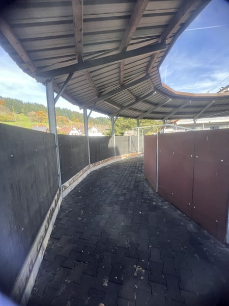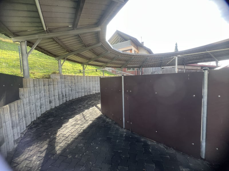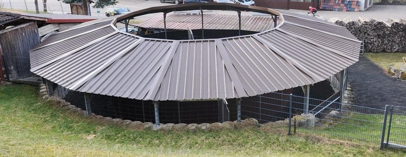Verkaufe unsere wenig genutzte, überdachte Pferde-Führanlage für 4 Pferde. Bei uns hat sie einen Aussendurchmesser von 14 Meter. Sie wäre aber variabel zwischen 13 und 16 Metern aufbaubar. Zu beachten ist, dass die Aussenumrandung und somit auch die Dachgrösse, speziell für uns konstruiert wurde da die Anlage in den Hang gebaut wurde. Die Anlage muss selber abgebaut und abtransportiert werden!!! Mithilfe von uns kann angeboten werden. Die komplette Führanlage ist bestehend aus: Führmaschine 4'000.00 Lauffläche aus Gummi-Pflastersteinen 500.00 Überdachung 5'500.00 Innenbegrenzung aus Siebdruck-Platten und 17 verzinkten 2 Zoll Rohren Aussenumrandung aus Schalholz Massives Eingangstor (hat Wetterbedingte Gebrauchsspuren) s. Bilder Seitliche Stützen für die Dachkonstruktion (9 x gleiche + 8 x unterschiedliche Längen) Dachkonstruktion aus Eisenträgern, Holzbalken, Trapezblech + Beleuchtung = Gesamtpreis 10'000.00 Der Preis ist VHB. Bevorzugt werden Komplett-Abnehmer. Privatverkauf. Keine Garantie oder Rücknahme.