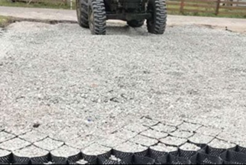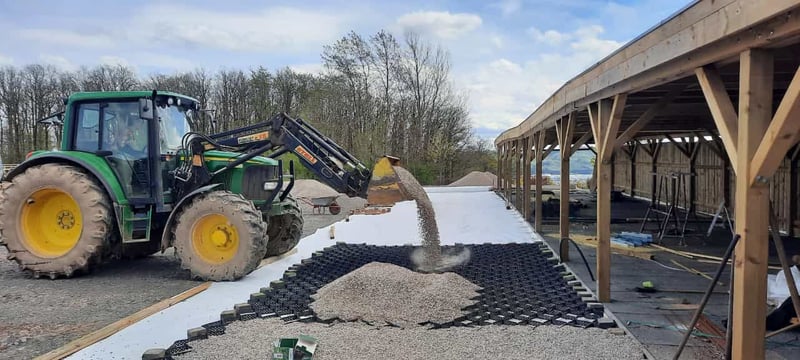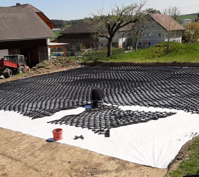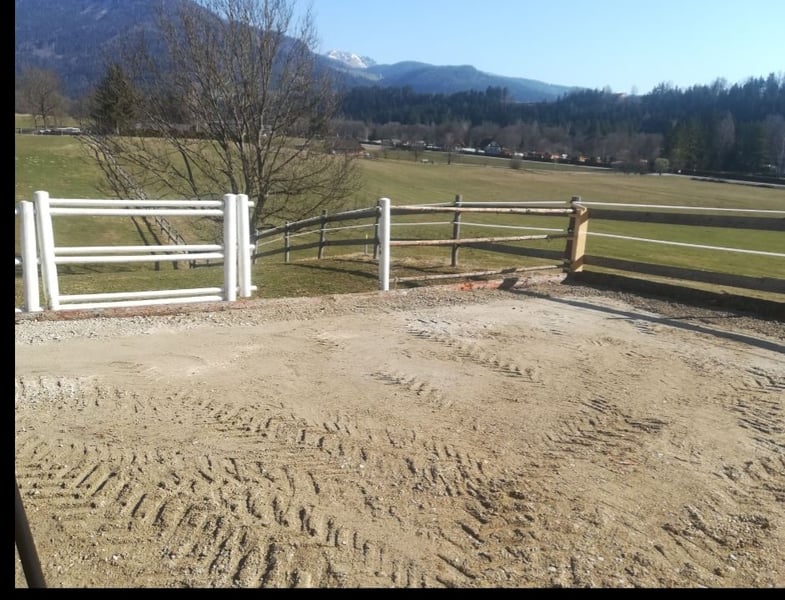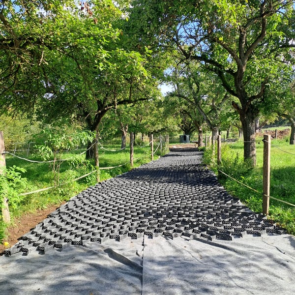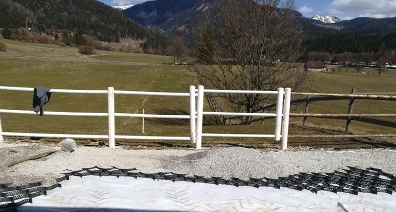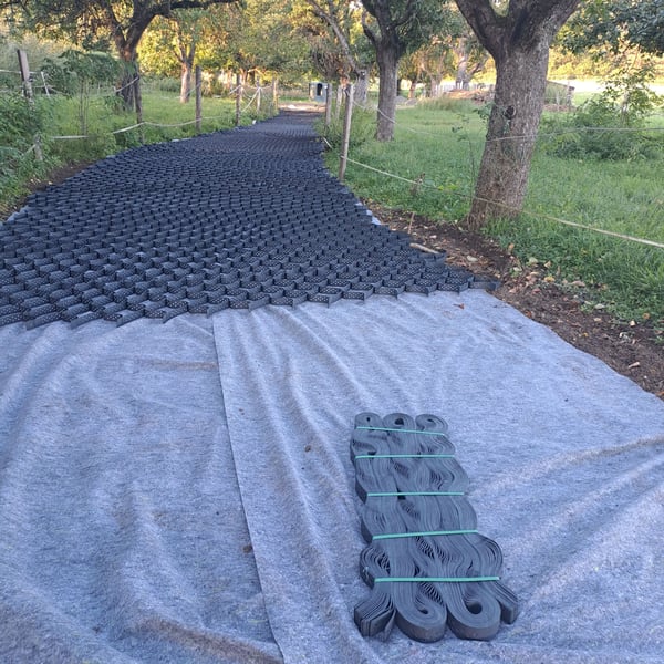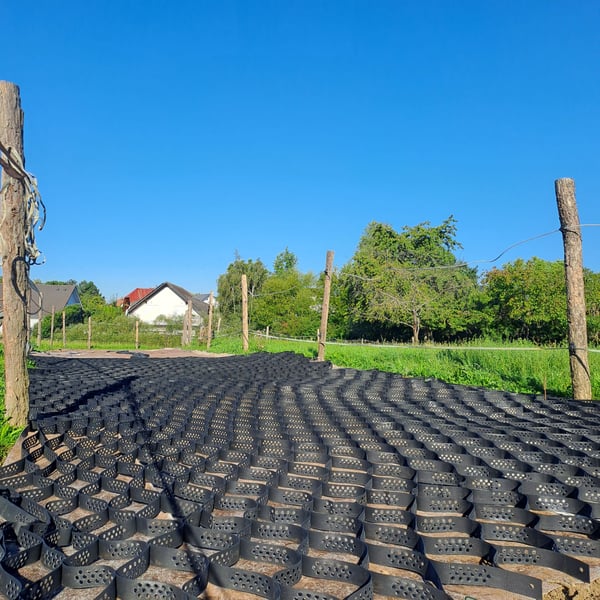 Frühlingsangebot 20% Rabatt • Lange Haltbarkeit: Entwickelt für den Paddock- und Reitplatzbau. • Preisgünstige Alternative: Kosteneffizienter als herkömmliche Paddockplatten. • Schnelle Verlegung: Größere Flächen (über 20 m²) können schneller und flexibler befestigt werden. • Original Geowaben www.prunkperd.de Bei Fragen können sie mich gerne unter 0176 57032922 kontaktieren Jahrelang getestet und verbessert Höhe 5 cm, 4,25 m x 5,10 m, ca.21 m2, -3,22€ pro qm2, pro Stück 69 Euro Ab 10 Stück 65 Euro • Bewährt: Jahrelange Tests mit Kaltblütern und schweren Fahrzeugen (z.B. LKW mit 60 Tonnen). • Wasserversickerung: Hält bei starkem Regen stand, das Wasser versickert gut. • Kundenfeedback: Positive Rückmeldungen über Haltbarkeit und gute Wasserdurchlässigkeit. Die dargestellten Bilder sind echte Kundenbilder. Vorteile gegenüber Paddockplatten: - Keine Dehnungsfugen - Flexibler und kostengünstiger - Versand: In ganz Deutschland und Österreich möglich. Auch für einen Reitplatz am Hang geeignet. Hohe Steigungen sind kein Problem mehr. Ein Auskoffern/ Abtragen des Erdbodens ist nicht notwendig!!! Ein weiterer Unterbau unter den Waben ist nicht notwendig und sogar kontraproduktiv, da dass Wasser dann nicht mehr gut versickern kann. Sie werden direkt auf das Vlies aufgebracht, haben eine Höhe von 5cm und werden wie eine Harmonika auseinandergezogen. Dieses Befestigungssystem ist flexibel, bricht nicht und ist sogar mit schweren Lkws oder Traktoren befahrbar. Die Geowaben werden mit Splitt oder Schotter zb 8-16 Körnung 5cm hoch aufgefüllt, darauf kommt eine leichte Schicht Mineralgemisch darauf (nur 2 cm hoch z.B. 0-16 oder 0-32 Körnung). Darauf kann schon die Sandschicht folgen. Somit erspart man sich fast 20 cm Schotter, was zu einer massiven Kostenersparnis führt. Die überschüssigen Teile können abgeschnitten werden und an einer anderen Stelle verbunden werden. Mit diesem System lässt sich auch Kunstrasen optimal stabilisieren. Hier braucht man die Geowaben nur mit Splitt verfüllen, das Mineralgemisch kann weggelassen werden. Der Kunstrasen liegt bombenfest und kann dann nicht mehr einsinken.