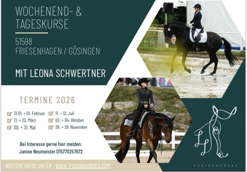 Wochenend–/ Tageskurse mit Leona Schwertner in 51598 Friesenhagen 20. & 21.03.2026 (noch 1 Platz für ganzes Wochenende oder als Tageskurs frei) 19.04.2026 Zusatztermin Trailtageskurs (noch 4 Plätze frei) 30. & 31.05.2026 11. & 12.07.2026 03. & 04.10.2026 28. & 29.11.2026 Veranstaltungsort: Pferdehof Gösingen, Gösingen 1, 51598 Friesenhagen ___________ Fusionhorses - eine Fusion der Reitweisen, darum geht es in Leonas Konzept Westernreitkurs / Individualreitkurs bei Leona Schwertner - Fusionhorses (EWU Trainerin B, Pferdewirtin Spezialreitweisen Westernreiten) Ihr Konzept: Aus jeder Reitweise das Beste heraus holen. Der Individualreitkurs mit Dressur- und Westerntrainerin Leona Schwertner ist für jede Rasse, jede Reitweise und jeden Leistungsstand geeignet. Egal ob Du Einsteiger, Fortgeschrittener und Turnierreiter bist, ob Du ein erfahrenes Pferd oder ein Jungpferd hast, Du wirst dort abgeholt, wo Du gerade stehst. Leona deckt sowohl die klassische Reitweise als auch die Westernreitweise und Bodenarbeit ab. Ihr Training findet in zwei 30 min Reit- und/oder Bodenarbeitseinheiten nach individueller Gestaltung statt: Elemente aus der klassischen Reitweise / Elemente aus der Westernreitweise / Bodenarbeit / nach deinen Wünschen Der Unterricht findet in einer 20 x 60m großen Reithalle statt. Jeder reitet sein Pferd vor der Einheit selber warm. Es stehen feste Boxen zur Verfügung. Die Pferde werden mit Heu oder Heulage während des Aufenthalts versorgt. Die Mittagspause findet in einem beheizten Reiterstübchen statt. Kursgebühren je nach Aufenthaltsdauer: Kursgebühr Tageskurs: 120,00 EUR Kursgebühr Wochenendkurs: 240,00 EUR Hallennutzung pro Tag: 20,00 EUR Box pro Tag: 20,00 EUR Es kann eine Unterkunft für 25 € die Nacht gestellt werden. Weitere Infos zur Trainerin findest Du unter www.fusionhorses.com Für die Anmeldung oder für weitere Infos kontaktiere mich gerne.