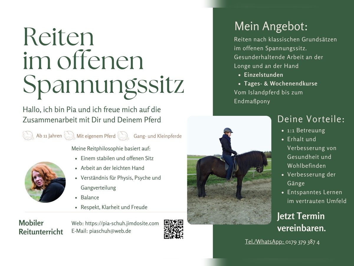 Reitunterricht & Bodenarbeit Hier geht es um mehr als Reiten: Es geht um echte Verbindung, Vertrauen und Leichtigkeit. Mein Unterricht fördert das feine Zusammenspiel zwischen Mensch und Pferd – mit Gefühl, Klarheit und Respekt und dem klaren Ziel der Gesunderhaltung deines Pferdes. Mein Fokus liegt auf den Islandpferden, ich arbeite jedoch gerne mit Pferden aller Rassen. Durch klassische Dressur, für gezielte Gymnastizierung und einen bewussten Reitersitz helfe ich dir, dein Pferd gesund, beweglich und motiviert zu erhalten. Auch beim Wiedereinstieg, nach einer Pause, begleite ich euch durch die Bodenarbeit um Euch gut auf das Reiten vorzubereiten.