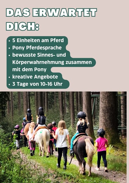 12.-14.9.26 Das Starter Camp richtet sich an Vorschulkinder und Schulkinder bis ca 10 Jahre. An drei Tagen werden Ihnen in kleinen Gruppen die Basics an und auf dem Pony gezeigt. Es erwarten euch: + 5 Einheiten an und auf dem Pony + erlernen der Pony Pferdesprache + bewusste Sinnes- und Körperwahrnehmung zusammen mit dem Pony + sowie kreative Angebote rund ums Thema Pferd Ziel ist nicht nur das harmonische Zusammenspiel zwischen Mensch/Mensch und Mensch/Tier, sondern auch die wichtigen Fähigkeiten spielerisch zu trainieren die für die Schule so wichtig sind: + Aufmerksamkeit schenken und bekommen + Grenzen setzen und wahren + und Disziplin fordern und selber diszipliniert sein. Wir freuen uns drei wunderbare Tage auf dem Ponyhof mit den Kindern! Kostenpunkt sind € 245,-. Los geht es um 10 Uhr am Hof und die Kinder können um 16 Uhr wieder abgeholt werden. Veranstaltungsort ist die idyllisch gelegene Waldreitschule Litte Horse Ranch St. Anna bei Mindelheim. Anmeldungen bitte direkt über die Homepage: https://www.developeyou.de/Kontakt/Anmeldung-Reitcamp/