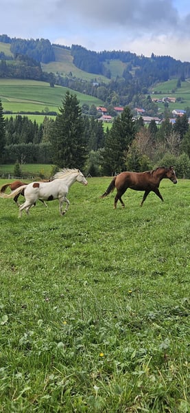 Wir bieten Aufzuchtplätze für Quarter und Paint Horses in unserem Stall im Oberallgäu an. Die Pferde leben in Gruppenhaltung in einem großen Offenstall, Stuten von Wallachen und Hengsten getrennt. Bei wetterlicher Gegebenheit kommen die Pferde so oft wie möglich auf unsere großen Koppeln. Es steht den Pferden 24/7 Heu oder Gras zur Verfügung. Artgerechtes Aufwachen im Herdenverband steht für uns an erster Stelle. Bei Interesse oder weiteren Fragen, meldet euch gerne bei uns
