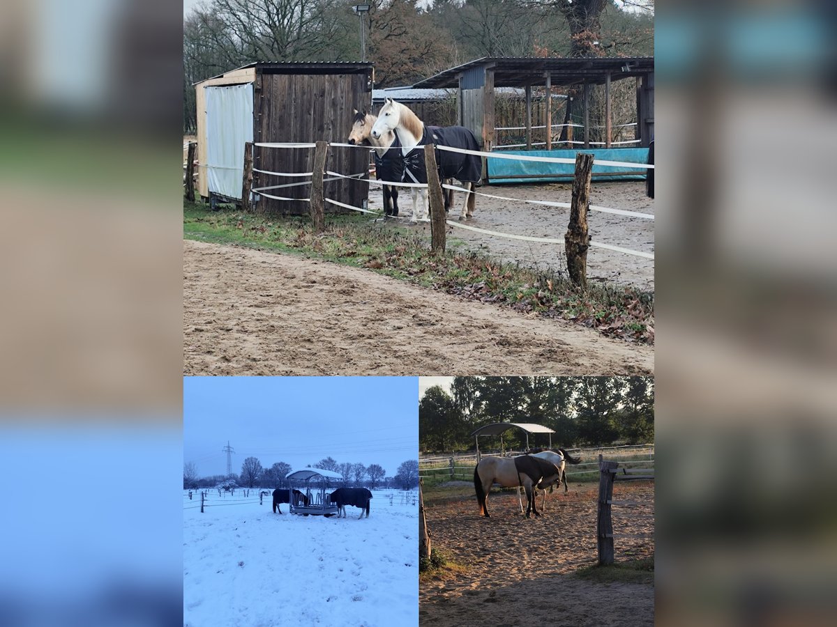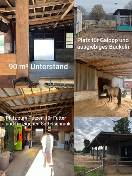 Hallo liebe Besitzer*innen von Wallachen mit und ohne Atemwegsproblemen, in unserem privaten Offenstall ist ein Platz für ein freundliches Hafermoped bis 1,60 m frei. Wir stehen auf einem Hof mit 13 autarken Offenstallkonzepten. Unsere Gruppe besteht aus maximal 4 Wallachen. Derzeit stehen da zwei spanische Jungs (11 und 23 J.), die sich über spielfreudigen Herdenzuwachs freuen würden. ***Fütterung*** Wir füttern bedampftes Heu (ca. 10 kg pro Pferd) aus einer automatischen Heuraufe mit Netz. Wasser gibt es aus einer frostsicheren Selbsttränke. Winter: Fresszeiten von insgesamt ca. 10 - 12 Stunden über Tag/Nacht verteilt mit max. 4 Stunden Pause. Sommer: bis zu 10 Stunden Weide tagsüber und nachts ~5 kg Heu pro Pferd. Sie gehen über ein automatisches Weidetor raus und haben jederzeit Zugang zum Paddock und Unterstand. ***Mitarbeit*** Wir sind ein Selbstversorgerstall, d.h. wir müssen Reparaturen und andere anfallende Arbeiten selbst erledigen. Der Unkostenbeitrag umfasst Platz, Heu (10 bzw. 5 kg) und Instandhaltung. Bei 4 Pferden fallen 2 Stalldienste pro Woche an, d.h. Paddock/Weide absammeln, Heu vorbereiten, fegen. Wir haben kurze Wege, das Heu muss nicht weit getragen werden. Der Stalldienst kann eventuell abgetreten werden. ***Ausstattung*** - beleuchteter Reitplatz - Bodenarbeitsplatz - Longierzirkel, - Strom, Licht, WC - Hunde können mitgebracht werden - keine Stall-Öffnungszeiten - eigene*r Reitlehrer*in kann mitgebracht werden - den wunderschönen Klövensteen erreicht man in 15 Minuten Falls es dich anspricht und es zu den Bedürfnissen deines Pferdes passt, melde dich!