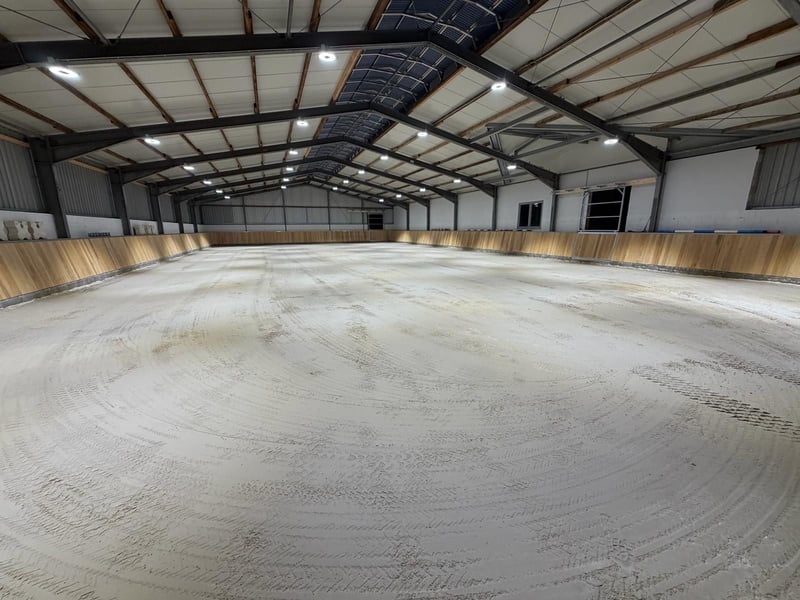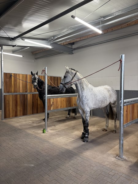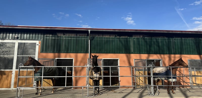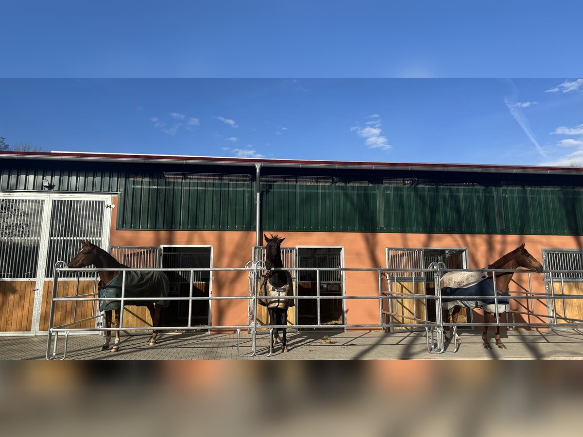 Paddockboxen auf neu erbauter Anlage frei Die Pferde haben von morgens bis abends die Möglichkeit draußen auf gepflasterten Paddocks zu stehen. Außerdem stehen auch großzügige Weideflächen und Sandpaddocks zur Verfügung. Die Anlage verfügt über eine Reithalle (20 x 40) mit einem Ebbe-Flut Boden und Putz- und Waschplätzen. Durch die offene Bauweise mit Lochblechen ist immer ein gutes Klima im Stall. Kein Misten