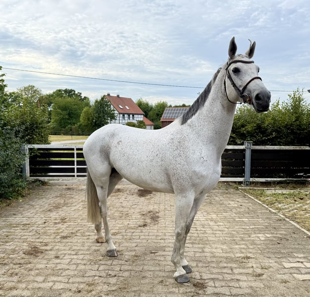 For sale is this stunning and completely honest 9-year-old mare named "Lovers Last Lady." She stands approximately 1.65 meters tall and is an ideal horse for transitioning riders or amateurs. She is absolutely straightforward and fearless in daily handling. She forgives rider mistakes and is always honest, yet very gentle to ride. She has won at A-level show jumping, placed at L, and competed at M. She is still completely unspoiled and has been introduced to competition in a targeted and gentle manner. The mare has a small cosmetic flaw—a slit in her ear—that does not affect her in any way. Because of this, we affectionately call her "Schlitzohr" (trickster). She jumps everything—no matter what is in front of her—and always, from any situation. An absolute reliable partner and a fantastic teacher. The mare has been recently shod and is in excellent health. For serious inquiries, please feel free to contact me at the following phone number: 015206158953.