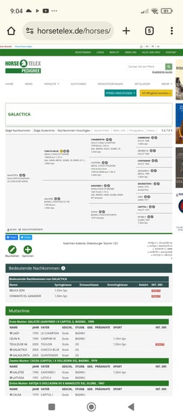 Biete hier eine Zuchtstute aus dem Hause Schockemöhle zum Verkauf an. Die Stute stammt vom Ausnahmevererber Chacco-Blue ab. Ihre Mutter Galatee von Ganymed I x Capitol I war selber bis 1, 50 m Springen platziert. Galactica ist 2005 geboren und 168 cm groß. Sie selbst hat hoch erfolgreiche Nachkommen die bis 1,55 m platziert sind. Sie ist die Halbschwester von Toulouse (von Toulon), die unter Henrik von Eckermann an den Olympischen Spielen 2012 teilgenommen hat. Die Stute kann auch noch geritten werden. Anfragen bitte ausschließlich per Anruf unter +49 1573 9062736