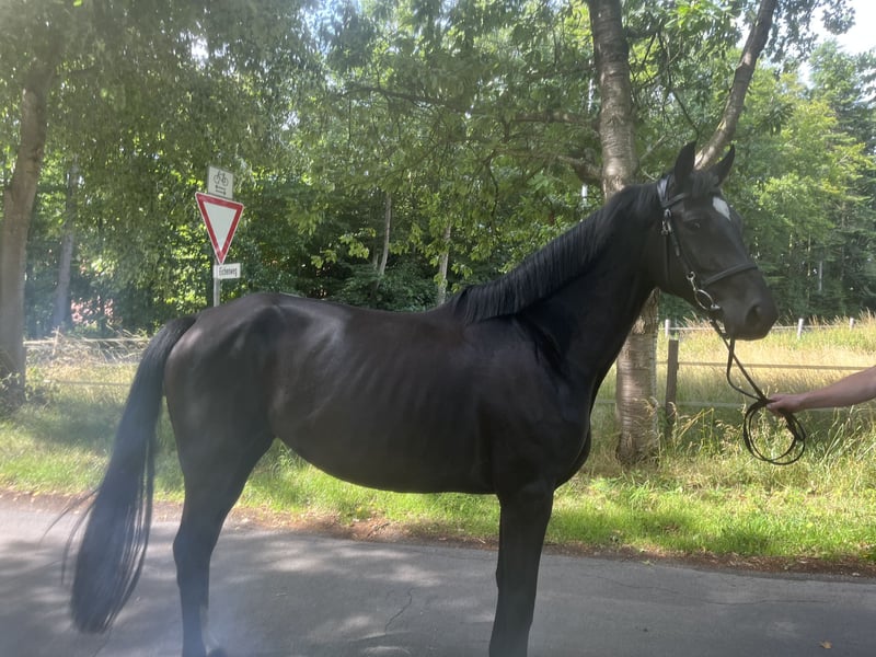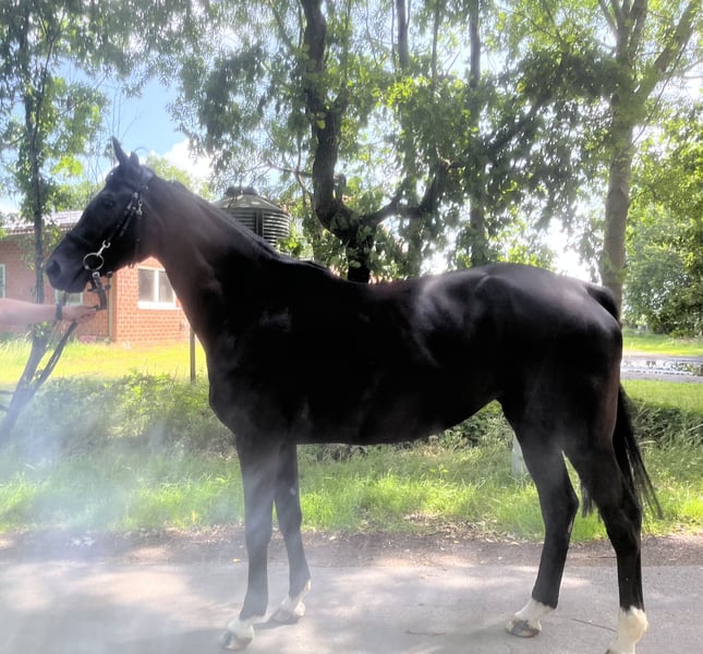 For sale is a beautiful Oldenburg mare, born in 2020. This elegant black mare stands at approximately 163 cm and impresses with her appealing stature and harmonious exterior. She was ridden from December 2024 to February 2025. She has been trained in all three basic gaits. Before being backed, she was driven and showed herself to be well-behaved in a pair. Her teeth were done in January 2025. Due to a finding from the vet check in February 2025, she is being sold well below value, as she is not suitable for our jumping stable. Additionally, she weaves in the stable. However, she does not do this in pasture housing with other horses. Since February, she has not been ridden, so she is not suitable for beginners due to her training level. She would be ideal for a leisure rider/driver, and smaller jumps should not be a problem. If you are interested or have any further questions, please feel free to contact us!