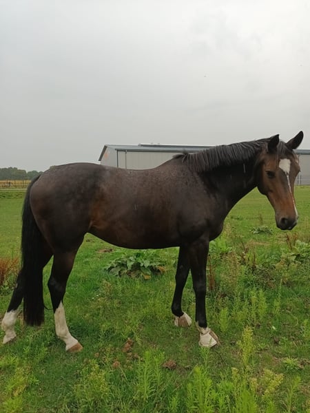 We are selling our beloved 8-year-old OS-registered show jumping mare by Balou Peggio with a premium status from the OS Verband, out of the S**-winning elite mare Sevana by Silvio I – Cosinus – Vollkorn xx – Manolete xx. We bred and trained the mare ourselves. At four years old, she foaled a top-quality stallion prospect by Asca Z for the autumn elite auction in Vechta. Due to her excellent rideability, character, and size (16.1 hh), she was intended to be the future mount for our 11-year-old daughter. Unfortunately, she sustained an injury two years ago (cartilage damage in the elbow joint – veterinary report available), which now prevents her from competing in show jumping. Primarily, we are offering her as a broodmare because of her excellent pedigree, but we could also see her as a wonderful leisure partner for fun riding (we haven't ridden her since last summer due to her injury). Only for good hands! No dealers!