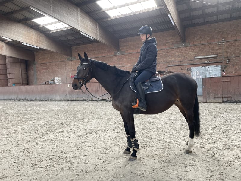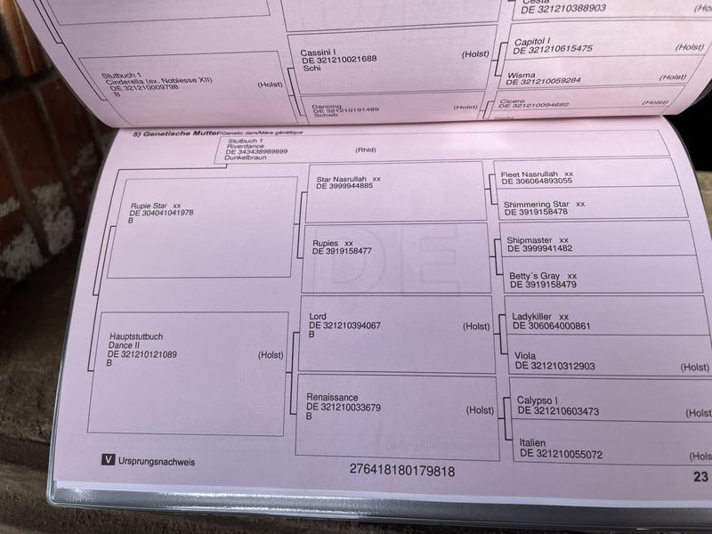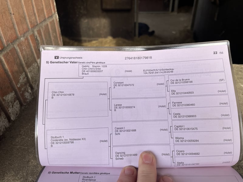 War beim Vorbesitzer als Trägerstute eingesetzt und hat drei Embryos ausgetragen. Wurde im Winter 24/25 angefangen anzureiten. Seitdem regelmäßig ein bisschen geritten. Erste Sprünge unter dem Reiter. Eine sehr liebe Stute mit viel Blut. Kennt unterschiedliche Reiter, hat aber gerne eine Feste Bezugsperson. Komplette Abstammung siehe Fotos