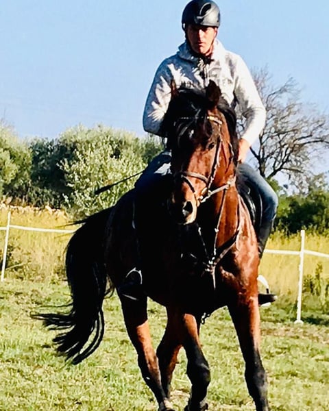 Llevo a Leon desde hace 10 años. Nunca ha mostrado comportamientos de semental, y con frecuencia se queda junto a yeguas o sale a pasear con ellas. Nunca ha estado enfermo. En su potrero sufrió una lesión por pisotón, donde se formaron chips que fueron completamente eliminados mediante una operación. Esto ocurrió cuando tenía 6 años. Desde entonces, se le monta regularmente en paseos de ocio. Hace unas semanas, salió a montar en doma clásica y salto con una jinete principiante, ¡y en ambas disciplinas quedó colocado! Disfruta mucho de los paseos en campo abierto. En general, es un compañero bastante tranquilo. Por eso, también es muy adecuado para jinetes nerviosos o principiantes. Es muy simpático, muy bonito, muy bien educado en el manejo, tranquilo para la ferradura y el transporte, y uno de sus pasatiempos favoritos sin duda es comer mucho heno 😄. El espacio es claramente más importante que el precio.
