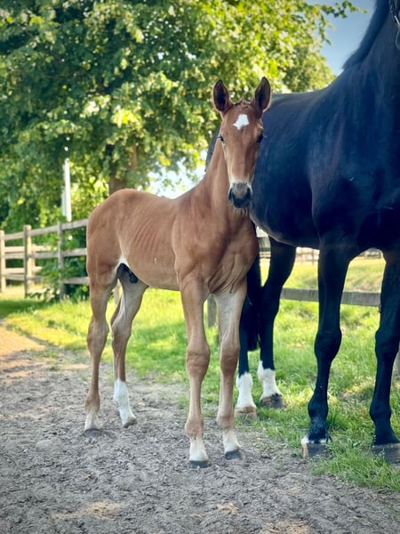 Sporty and bred from one of the most successful mare lines - born 21.05.2025 Mother Elite Mare Honey Moon has already produced five S-successful top horses and state premium mares, including: Cold Play by Contendro I (1.65m under Fredrik Jönsson (SWE) and silver medal in Tryon (USA) 2018); Quidam MB by Quidam's Rubin (international 1.60m with Adrienne Sternlicht (USA)); The Dude by Carry Gold (1.60m under Samuel Hutton (GBR)); Cornet Star by Cornet Obolensky (international 1.45m with Rachel Sandoz (SUI)) as well as Honey Pearl by Emerald van’t Ruytershof (international 1.45m - Dries van der Linden (BEL)) Honey Girl by Clinton (state premium and elite mare with internationally S**-successful offspring) Honey Star by Balou du Rouet (reserve champion mare of the elite mare show in Rastede with a score of 10.0 in free jumping) further successful horses from the mother line see photo.