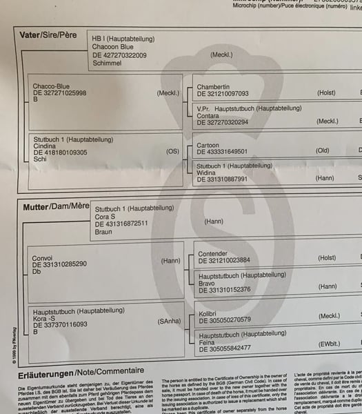 Encantador hijo de Chacoon Blue. Nacido el 28.5.23. Aporta mucho potencial, es muy tranquilo en el manejo y se deja cargar sin problemas. Su hermana de padre, Chacoona CS, está teniendo mucho éxito en el deporte. Chacoon Blue tiene como padre nada menos que al semental de renombre Chacco-Blue. Chacco-Blue lideró durante años el ranking de los mejores sementales de salto del mundo. El padre materno, Convoi, hijo de Contender, ya ha producido a la Coverlady/Heiko Schmidt, que ha logrado múltiples posiciones destacadas en el Derby de Hamburgo. La abuela Kora fue ganadora en saltos de nivel medio y es hermana de Katja, madre del exitoso AI Pacino/Ulrich Kirchhoff en 1.55 m, y de Kassandra, que ha producido a Cedric, que ha sido aprobado, así como a tres caballos de salto exitosos en 1.40 m y más.