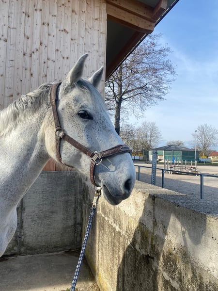 Hallo, mein Name ist Cosby, bist du auf der Suche nach einem neuen Freund und einem treuen Partner auf vier Hufen? Ich glaube dann sollten wir uns kennenlernen Ich bin ein bester Kumpel Typ und mit meinen 13 Jahren im perfekten Alter. Da ich in der Vergangenheit schon ein paar Besitzer hatte ist es mir und meiner Familie besonders wichtig, dass ich einen Endplatz bekommen, bei dem ich mich rundum wohlfühlen kann. Ich bin absolut menschenbezogen und ich liebe es, verwöhnt zu werden. Egal ob du Lust hast mich stundenlang zu putzen, mit mir spazieren zu gehen oder zu kuscheln, ich liebe alles und freue mich wahnsinnig, wenn mein Mensch Zeit mit mir verbringt. An der Bodenarbeit und dem Gelassenheitstraining habe ich viel Freude und meine Besitzerin sagt ich bin ein richtig mutiger und geduldiger Kerl. Früher war ich ein Springpferd und habe durch meine Besitzerin eine sehr gute dressurliche Ausbildung bis hin zu 2er Wechsel genossen. Da ich nun einen bekannten Befund im Vorderbein habe, der aktuell gut gemanaged ist, werde ich ausdrücklich nicht als Springpferd sondern als Freizeitpartner abgeben. Ich hab viel Freude an regelmäßiger, angepasster Arbeit unter dem Sattel und bin dabei brav und stets kooperativ. Da ich nichts desto trotz keine Schlaftablette bin, solltest du kein Anfänger sein. Ich gehe gerne mit einem Kumpel ins Gelände und bin dabei wirklich brav. Alleine bin ich manchmal etwas unsicher. Ich fühle mich sehr wohl unter einem gefühlvollen, geduldigen und ausbalanciert sitzendem Reiter. Ich bin Schmiede- und Verladefromm. Umziehen werde ich nur in einem Umkreis von 100 km, sodass meine bisherige Familie mich besuchen kommen kann. Abgabe erfolgt ausschließlich mit Schutzvertrag. Weiterer Details gerne im Persönlichen Gespräch.