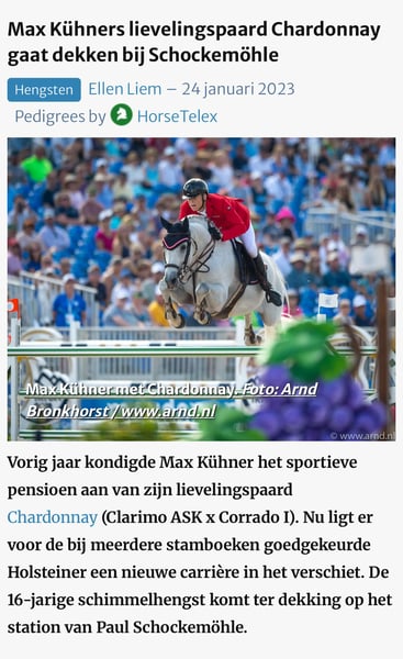 Zeer aansprekende en stoere 2,5jr schimmel ruin. Een paard met goede en krachtige bewegingen. Deze ruin heeft bijzonder veel springkwaliteit. Hij toont veel vermogen en een super techniek. Dit heeft hij niet van een vreemde; hij komt namelijk uit de bekende fokkerij van Schockemöhle. Vader Chardonnay was het favoriete paard van Max Kühner. Deze holsteiner sprong succesvol op het allerhoogste niveau. Afstamming: Chardonnay ( Clarimo x Corrado I) int 160m jumper x Messenger int 160m ( Montender x Baloubet du Rouet ) x Centus (Cento) x Alexis. *PRIJS €7500.- exclusief btw Bij interesse graag bellen. +31643197337