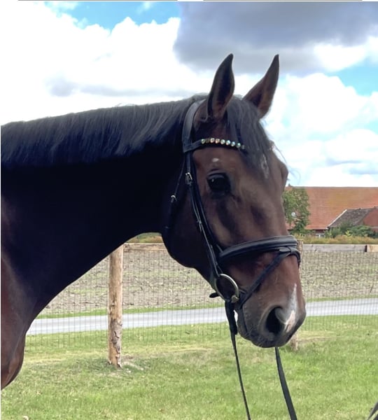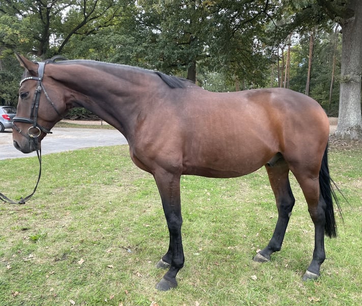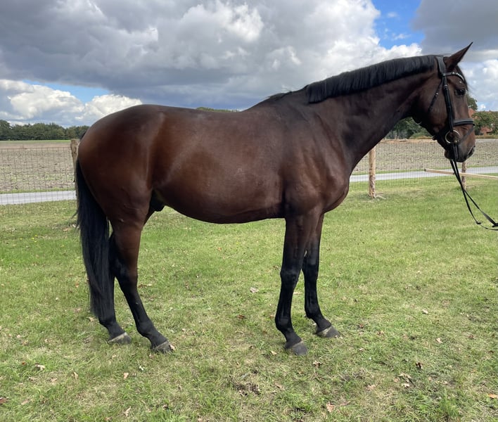 Zum Verkauf steht ein 4-jähriger, 170cm brauner Wallach von Carridam x Jacomar. Cajou ist ein liebevoller und lernwilliger Kumpeltyp aus Züchterhand. Er wurde Anfang des Jahres langsam und schonend angeritten und seit dem behutsam weiter ausgebildet, zeigt sich hier bei steht rittig und mit guten GGA ausgestattet, springt fliegende Wechsel und ist Parcoursfertig, hat seine ersten Erfahrungen im Gelände sowie auch schon das drum herum auf dem Turnier mit Abreiteplatz gemacht, wobei er sich unerschrocken zeigte und uns mit Vertrauen begegnete. Natürlich muss er auf Grund seines Alters noch vieles lernen, aber er hat das Herz am richtigen Fleck und genau die passende Arbeitseinstellung, bringt passendes Go mit, nicht zu viel aber auch nicht zu wenig, immer angenehm zu reiten. Hunde, Katzen, Ziegen, Schweine, Führanlage, Trecker und alles an Geräten, die auf einem Hof so anfallen, sind im bekannt. Er kennt 24/7 Wiese aus der Aufzucht im Sommer, wie aber auch tagsüber Wiese und nachts Box. Gute Röntgenbilder ohne Befund liegen vor und können eingesehen werden. Allergien, Krankheiten oder Verhaltensauffälligkeiten sind uns keine Bekannt. Eine aktuelle AKU kann bei ernsthaften Interesse jederzeit von ihrem Tierarzt des Vertrauens erstellt werden. Ein Probereiten ist jederzeit möglich.