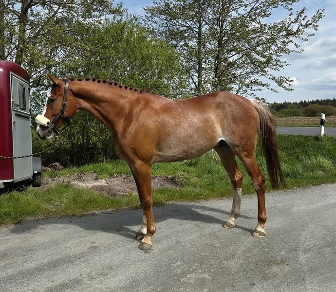 For sale is this beautiful 2020 gelding. He is a son of Limbothello × Baldus. Limbothello is an excellent stallion successful in advanced classes, notable for his striking coloration, which he has also passed on here. The licensed stallion achieved scores of 9.5 in show jumping competitions. The gelding, approximately 1.64 meters tall, has inherited not only a great appearance but also a good character and impresses with his gentle, pleasant rideability. He is very well-behaved in handling, whether with adults or children during grooming and leading. This year, he competed in his first tournaments (Show jumping A* and A**) and impressed with his clear mind, allowing him to place directly. He is an excellent riding horse for beginners, but I could also see him in eventing. ✅️ Shoeing and loading trained ✅️ Safe in the terrain ✅️ X-ray images available from 2024