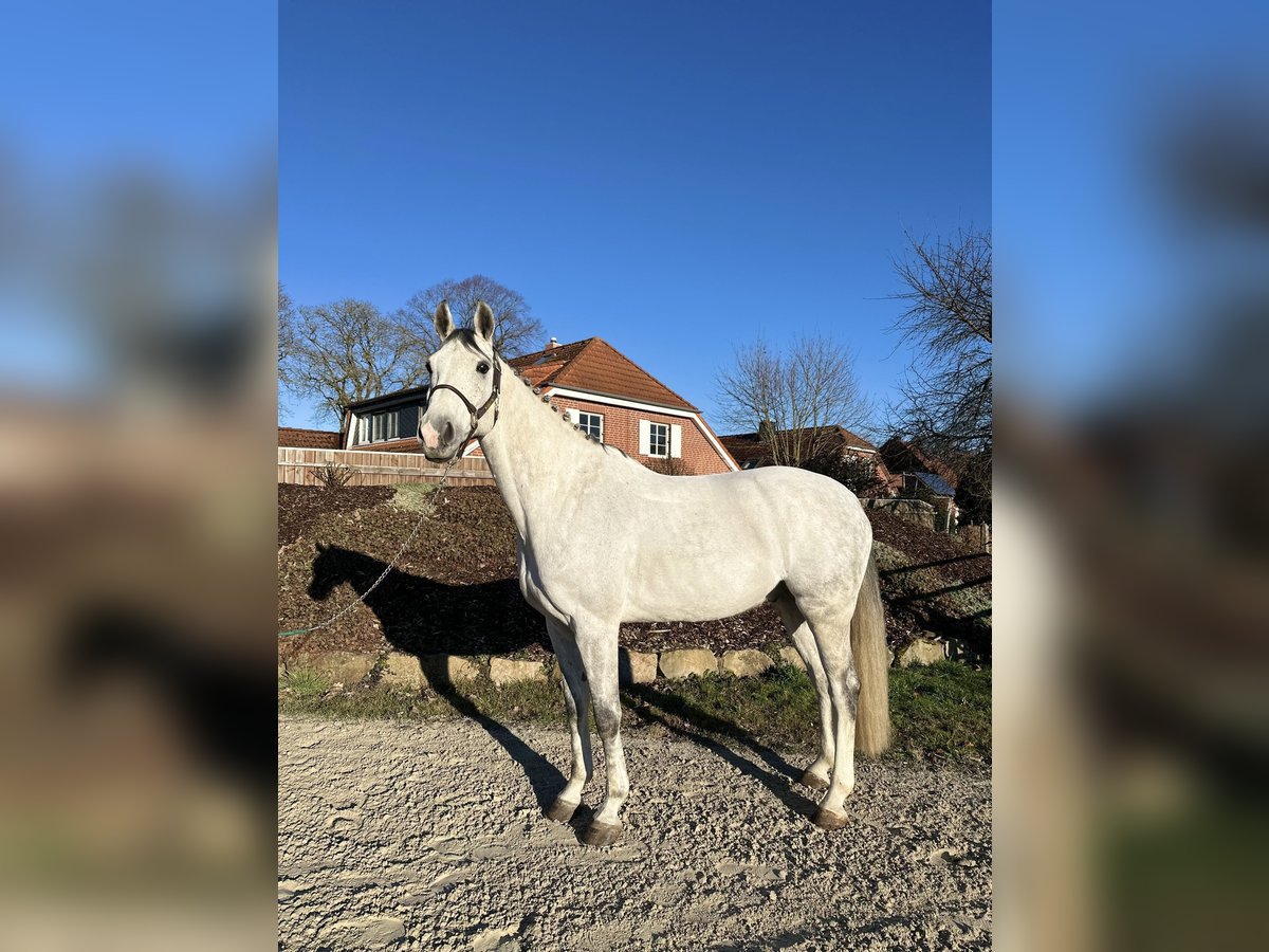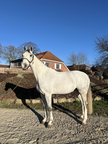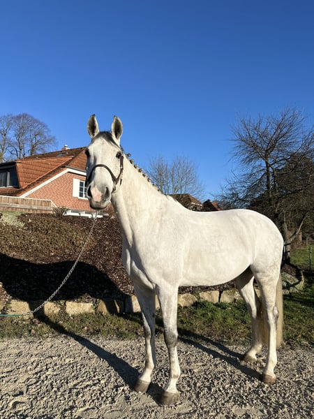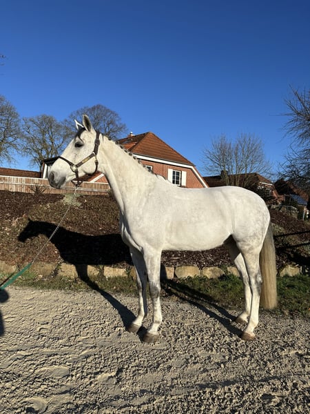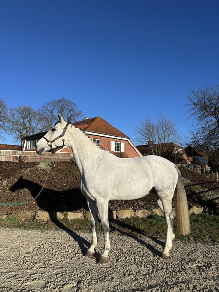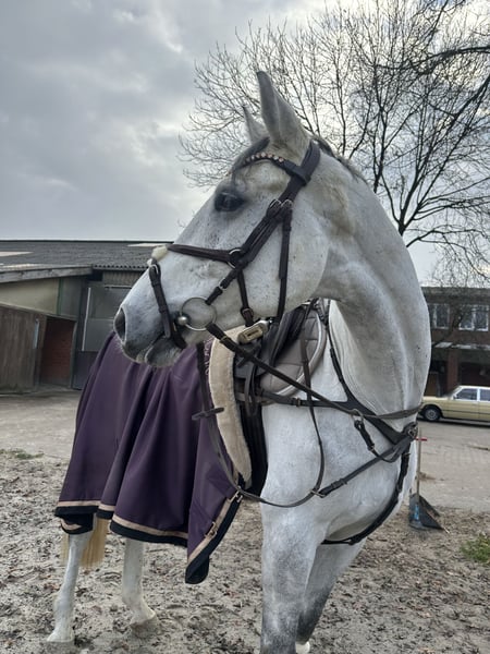 For sale: 🤍 Clifton 🤍 7-year-old gelding 🤍 approximately 16.1 hh "Schimmelchen" has only been with me for three months and has proven to be an absolute dream horse in terms of character. He impresses not only with his handsome appearance but also with his openness, loving nature, and friendly demeanor. Under saddle, he is usually a horse that needs to be encouraged to move forward and convinced to work. In the field, at competitions, or in new environments, he is absolutely well-behaved. Thanks to his rather unflappable nature when riding and his relaxed attitude, he would make a great partner for leisure riders, re-entrants, or those transitioning from other disciplines. With an experienced rider, I can also very well imagine "Schimmelchen" as a future foxhunter. He jumps reliably and well. In dressage, he now comfortably performs flying changes and traverses without any issues. Currently, he wears front shoes but can easily go barefoot. He would ideally have a pasture or paddock turnout. At the moment, he is stabled in a box with plenty of turnout space.