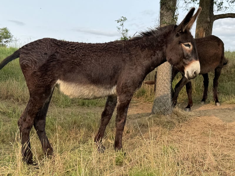 For age reasons, we are now reducing our stock of excellent large donkey breeding mares. While the older animals will continue to receive their retirement care with us, the younger ones prefer to seek a new home. Today, I would like to introduce you to the following two mares, who have grown up together and are inseparable (it would truly be heartless to separate them). Since they harmonize perfectly, they would make a super obedient pair. They are: Lioba Loreley and Lumière Loreley. Like all the other mares, the two are well-mannered, gentle, people-oriented, and affectionate. Their hooves have been cared for throughout their lives from day one, and they have been regularly dewormed in spring and autumn with Ivermectin or Moxidectin in rotation. They have never experienced any harm from humans. They have experience with people visiting them in the pastures, with individuals with disabilities spending many hours with them, and with groups that come for coaching; they go on hikes and much more. Our donkeys live as a herd on pastures that are many hectares large, have grass and hay available at all times, and do not get overweight as they have been able to maintain their natural grazing behavior. They are well-socialized and, of course, in excellent health. Since they live freely 24/7, they are alert and attentive, intelligent and motivated, and always look forward to contact with people. Therefore, they are suitable for any use, such as driving, hiking, riding for light individuals, and therapeutic work in emotional and social areas. They only go together and only in donkey-appropriate housing.