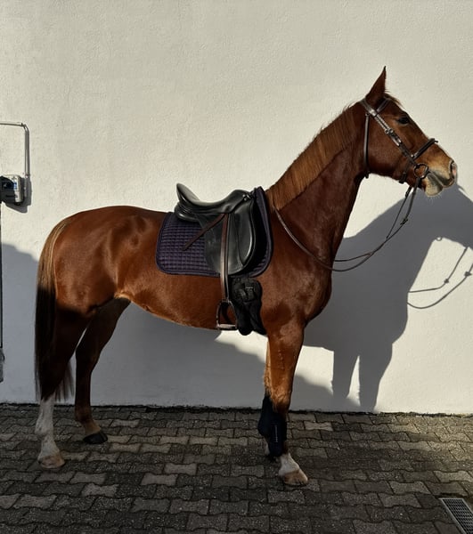 Schweren Herzens suchen wir für unsere 7-jährige Fuchsstute Kata ein neues, liebevolles Zuhause. Kata ist ein Pferd mit viel Potenzial, das in den richtigen Händen eine glänzende Zukunft vor sich hat. Im täglichen Umgang ist sie ein absoluter Schatz. Ob Putzen, Führen oder die allgemeine Stallarbeit – sie zeigt keinerlei Unarten und ist stets angenehm und ruhig. Sie kennt Schmied, andere Tiere, laute Umgebung etc. Sie steht von Sonnenaufgang bis Sonnenuntergang auf einem großen Paddock, Nachts in einer Paddockbox. Sportliche Erfahrung: In den vergangenen Jahren wurde Kata kontinuierlich von Kindern und Jugendlichen geritten und konnte bereits wertvolle Turniererfahrung im Springen sammeln. Sie kennt die Atmosphäre auf dem Platz und hat hier stets einen tollen Job gemacht. Reitunterricht mit und ohne Longe, Bodenarbeit und Ausritte absolviert sie auch sehr erfahren. Aktuelle Situation: Kata wurde zum Teil auch für meine 9-jährige Tochter gekauft. Wir müssen uns jedoch eingestehen, dass wir ihrem Ausbildungsstand und ihrem aktuellen Bedarf (6x die Woche Reiten) nicht mehr gerecht werden können. Kata zeigt sich in den letzten Wochen zunehmend schreckhafter und benötigt einen Reiter, der ihr die nötige Sicherheit gibt, konsequent die Führung übernimmt und sie reiterlich weiter fördert. Diese Aufgabe können wir aus persönlichen Gründen nicht stemmen. Aufgrund ihrer aktuellen Entwicklung ist Kata momentan nicht für Anfänger geeignet. Wir suchen für sie einen erfahrenen Reiter oder eine erfahrene Reiterin, die ihr mit Ruhe und Sachverstand die nötige Sicherheit zurückgibt. Ob für ambitionierte Amateure oder erfahrene Freizeitreiter, Kata hat sicher das Potenzial eine treue Begleiterin zu werden.