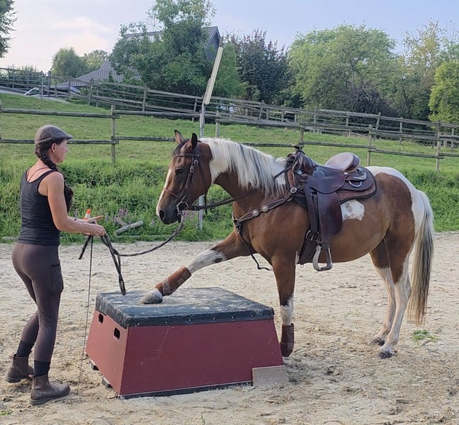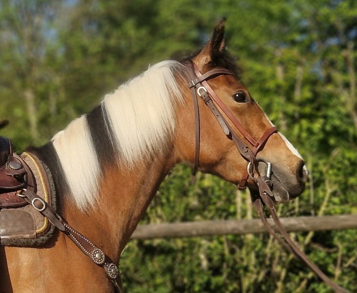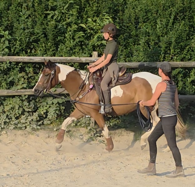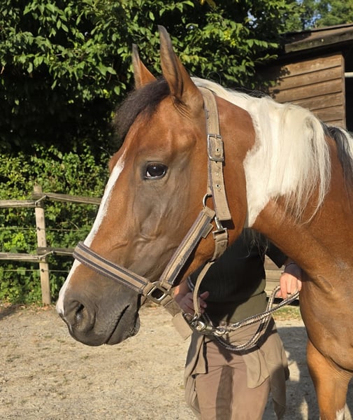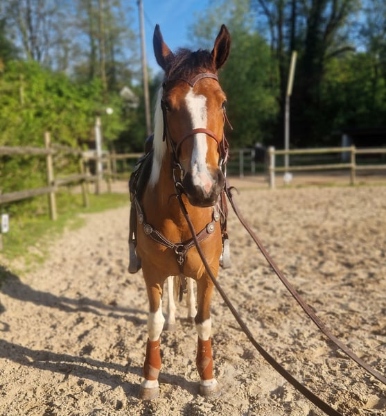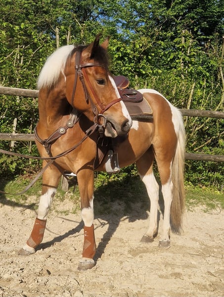 In augustus 2 jaar oude Paint Horse merrie zonder papieren met paardenpaspoort. Uiteindelijke grootte ongeveer 150-155cm. Ouders beide Paint Horses Vader: Pretty Cowboycadillac (zie foto's en stamboom) Moeder: Caroline (zie foto's) Lieve en mensgerichte, stoere jonge merrie, opgegroeid in een open stal, halstertraining, kent grooming en korte wandelingen als handpaard, maar ook kort longeren en wat grondwerk, gebit is gedaan, ingeënt en ontwormd. Een geweldig en mooi paard om zelf op te leiden. Als je serieus geïnteresseerd bent, kan ze worden bekeken in de buurt van Mettmann. Als je vragen hebt, schrijf dan...