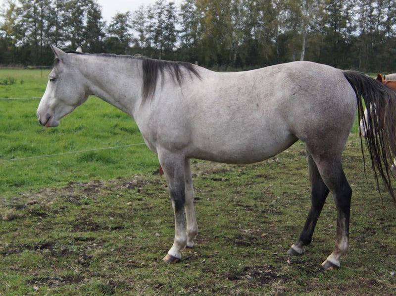 NW Beautiful Jazzgun - wunderschöne, graue Paint Horse Stute mit kräftigem Fundament und korrektem, geradem Beinen. Sie überzeugt durch ihre tolle Farbe und einen ausdrucksstarken, harmonischen Körperbau - ein echter Hingucker! Die Stute stammt aus bewährter, guter Reining/Cutting-Abstammung und ist NRHA einbezahlt. Sie wurde bislang aufgrund von Zeitmangel noch nicht angeritten und ist somit unverbraucht. Aufgrund eines Chips vorne rechts, der als Zufallsbefund bei einer AKU rauskam, wird sie als reitbare Zuchtstute abgegeben - sie zeigt keinerlei Lahmheiten oder Einschränkungen. Jazz ist 2019 geboren und hat ein Stockmaß von 150 cm. Sie besitzt einen ganz lieben Charakter, ist menschenbezogen, verschmust und immer händelbar. Ganz brav im Umgang. Jazz steht im Offenstall und ist herdentauglich. Sie ist 5-Panel n/n. Kennt Bodenarbeit und longieren. Jazz hat eine gute, alte Reining/Cutting Abstammung. Ihr Vater, JBars Cromed Gun ist ein Sohn vom Superior Open-Honor Roll Champion Gunners Crome Gun. Ihre Mutter ist eine proven Zuchtstute von Mister Dual Spring - IRCHA Open Cowhorse Futurity Champion, mutiple Open Bronze Trophy Champion or Reserve Bronze Trophy Champion, Producer of mutiple NRHA of Germany Open Breeders Futurity Finalists and NRHA of France Open Derby Champion.