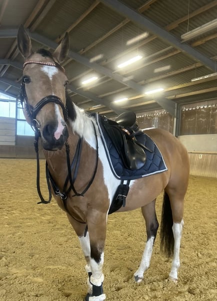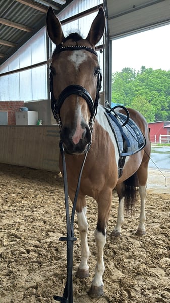 Verkaufe liebevolle Paint Horse Stute Zum Verkauf steht meine wunderschöne Paint Horse Stute, geboren im Jahr 2017. Sie besticht durch ihr beeindruckendes Tobiano-Farbmuster, das alle Farben vereint und sie zu einem echten Blickfang macht. Mit einem Stockmaß von 165 cm ist sie perfekt proportioniert und vielseitig einsetzbar. Ihre Leidenschaft sind Cavalettis und Ausritte in entspannter Form aber auch mal zum Gas geben. Sie ist ideal für die Freizeitgestaltung und eignet sich sowohl für gemütliche Ausritte als auch für anspruchsvollere Ausflüge. Sie ist sowohl im Dressur als auch im Westernsattel zuhause. Sie bringt die Basics für beide Spaten mit, da sie nicht Profimäßig eingeritten wurde. Wir haben das schonend und langsam im Alter von 5 Jahren gemacht und reiten sie seitdem immer nur sporadisch. Die Stute ist neugierig und frech, aber stets freundlich, menschenbezogen und gut im Umgang. Spaziergänge und Ausritte macht sie brav mit. Hallen und Platzarbeit möchte sie gerne schmackhaft gemacht bekommen. Z.B. mit Stangen und abwechslungsreichen Aufgaben. In Kreis laufen ohne Aufgabe findet sie blöd. Idealerweise wünsche ich mir für sie eine Bezugsperson die sich die nötige Zeit für sie nehmen kann und sie in einem Offenstall einstallt bzw. so dass sie tagsüber draußen stehen kann. Boxenhaltung kommt nicht in Frage. Sie liebt Kinder, ich möchte sie allerdings nicht als Anfängerpferd verkaufen. Die Stute ist nicht im regelmäßigen Training und wird nur sporadisch geritten aufgrund von Zeitmangel. . Es gilt definitiv Platz vor Preis. Geld spielt hier keine Rolle. Sie soll das beste Zuhause bekommen. -> Endplatz Bei Interesse oder weiteren Fragen stehe ich Ihnen gerne zur Verfügung. Ein persönliches Kennenlernen ist jederzeit möglich.