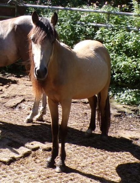 Bon Voyage, que nous appelons Trixie, est la fille d'une jument Tinker et d'un étalon Paso Fino. Malheureusement, elle est trop petite pour nous et cherche donc un joli foyer comme poney de conduite ou pour enfants. Elle est gentille et sans vices, mais plutôt timide envers les étrangers. Elle n'a pas encore été travaillée davantage, elle est donc seulement manipulée en licol. Elle a grandi dans un troupeau mixte en stabulation libre, où elle vit encore.