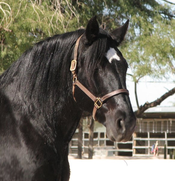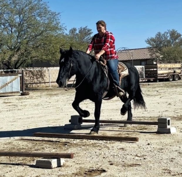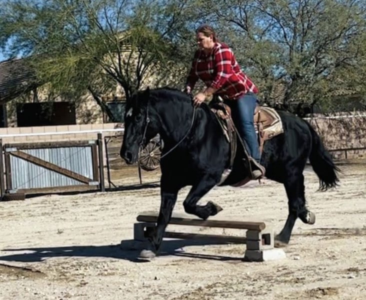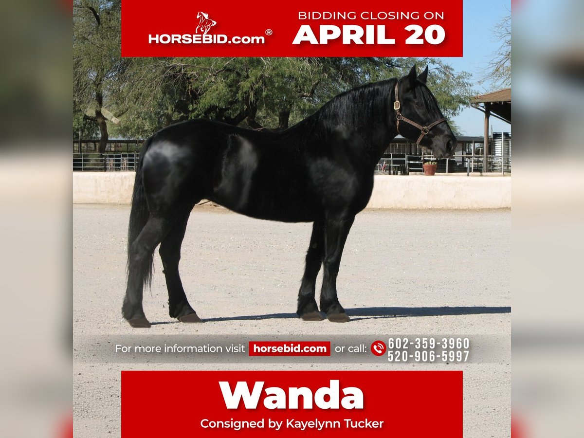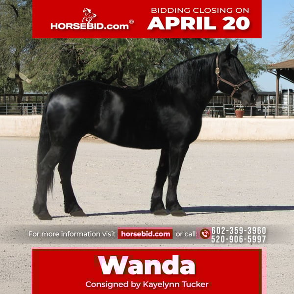 ⚜️𝐭𝐡𝐞 𝓔𝓵𝓲𝓽𝓮 𝐒𝐩𝐫𝐢𝐧𝐠 𝐂𝐥𝐚𝐬𝐬𝐢𝐜⚜️ Happening now thru MONDAY | APRIL 20th - Available EXCLUSIVELY on HorseBid's website! For more details and to register visit: www.Horsebid.com CONSIGNOR CONTACT: Kayelynn Tucker (Owner) 602-359-3960 (agent) 520-906-5997 LOCATION: Marana, AZ BREED: Percheron/Friesian Cross REGISTERED: No COLOR: Black HEIGHT: 15.3 AGE: 13 GENDER: Mare Wanda is a dream horse deluxe. Big Beautiful and super fun to ride. She stands an impressive 15.3 and is coal black. She has the massive presence of a Percheron with the elegant movement of a Friesian cross. She is very well broke both in the arena and on the trails. She has a smooth sitting trot and a nice lope. She is easy in her transitions and responds to voice commands. Wanda has been used in a lesson program with riders of all levels including seniors and children. She has always been safe and steady while doing her job. Wanda has many miles out on the ranch and the trail. She has been ridden around cattle, atvs, farm equipment and most everything else you find on ranch. Wanda has also been ridden in town, crossing some busy streets and always been trustworthy and safe. Wanda is very good with the farrier and enjoys being groomed. She stands tied quietly for a bath, brushing and is good with the clippers. Wanda has a kind and friendly disposition. She meets you at the gate and lowers her head to be haltered. Wanda is a barn favorite and has been a super fun to have around. If you are looking for a big, elegant trail partner that is also a deluxe to ride in the arena Wanda may be a great fit.