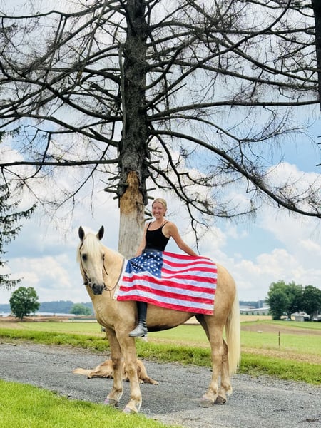 🍁𝒕𝒉𝒆 𝐅𝐀𝐋𝐋 𝑺𝒑𝒆𝒄𝒕𝒂𝒄𝒖𝒍𝒂𝒓🍁 Happening now thru MONDAY | SEPTEMBER 22nd - Available EXCLUSIVELY on HorseBid's website! For more details and to register visit: www.Horsebid.com CONSIGNOR CONTACT: CM Farms 717-875-2061 LOCATION: Gap, PA BREED: Perch/QH REGISTERED: No COLOR: Palomino HEIGHT: 15.2 AGE: 4 GENDER: Mare Who doesn’t love a pretty blonde? 😍 Meet ✨Charlotte✨—she’s a 4-year-old, 15.1–15.2hh Percheron/QH cross palomino mare. This girl is built right—she’s got all the curves, she’s sturdy, and she’s the perfect size for a variety of riders. Not only does she have the beauty, but she was blessed with brains too! She rides both English and Western, and she’s so broke to drive you could hitch her up in your sleep. She is the ideal family horse—you can pile multiple kids on her for a leadline ride or send the husband out on a trail! She always takes care of her riders and is totally a lovebug on the ground—especially with the littles. She is a rose among the thorns and truly one of the nicest mares we’ve come across.🌹 On the trail, Charlotte has packed a variety of riders for us, including complete beginners! She is careful, slow, and surefooted. She is always happy to go out, with a lovely attitude and a curiosity for adventure. Nothing can get under Charlotte’s skin. We have ridden her all over—through the woods, along the highway, in open fields, and into the river (she lovesss a good swim). She’s as unflappable as they come out on the trail. She will lead but generally ends up in the rear due to her slow, plodding nature. She’s in no rush and enjoys taking in the sights for a relaxing ride. She’s as comfortable as a couch and one you could ride all day long. She is absolutely no spook, buck, rear, or bolt—and no silliness (except maybe grabbing a quick snack when she gets the chance). This girl does love her food. 😆 Even if you aren’t a “mare person,” we can guarantee Charlotte will change your mind. She’s lovely and kind in every way. Under harness, Charlotte is experienced and reliable beyond her years. She is able to hitch up solo and drives away from the barn without a worry or care in the world. She’s been on our busy road with all kinds of traffic flying by her (including semi-trucks and loud motorcycles). She is as unflappable as they come and solid in a busy environment. She’ll even stand tied and wait for you to get your groceries and load them in the carriage. She’s been hitched single, double, and to various farm equipment. She’s driven through tunnels, water, farm lanes, construction sites—and the busiest of roads. She’s essentially dummy-proof to drive. She’s light in the reins and responsive to voice signals. We trust her so much under harness, we’ve had our baby on board—she’s never taken a wrong step.💕 Charlotte is also amazing in the ring! This girl is very hard to find a flaw in. She’s like riding a couch—so round and comfortable. She has a solid walk, trot, and canter both ways. Her canter is to die for, and she has the easiest trot to sit! Her favorite gait is probably the walk, and she’s not one that’s ever going to run away with you. She’s happy to mosey around on a loose rein but will happily put in the work and go when asked. Her brakes are impeccable—she will stop on a dime with just a “whoa” or a shift of your seat. She’s packed around the kids and adult beginners like a champ. She’s perfect for leadline rides and genuinely seems to love children with her whole heart. She will lower her head to their height just to get pets and love. She is also able to be athletic and has been coming along lovely over jumps. We’ve been keeping it light with the jumping due to her age, but we couldn’t ask her to do a better job. She’ll pop over cross rails and small verticals in the ring, and she’s even been out cross-country schooling! She is cute and honest in every way. With the right encouragement, she could easily excel in fox hunting or lower-level dressage. She has the proper foundation to go in any direction and is a superstar in every way.⭐️ On the ground, Charlotte is safe to work around. The kids can run around her, brush her, lead her in and out of the field, and tack her up. She’s one that comes up to you in the pasture begging for attention. She loves people and will put her head in your arms for a hug. She’s gentle taking treats and loves her cookies. She is well-behaved for the vet and farrier, and she loads right into the trailer. If you want a solid young horse to continue growing with—one that you don’t have to worry about and can relax on and with—Charlotte is all that and so much more. She’s quickly become a barn favorite, and we have no doubt she will thrive in any environment! We want the best home for this special girl. 💕 ✨Located in Gap, PA✨