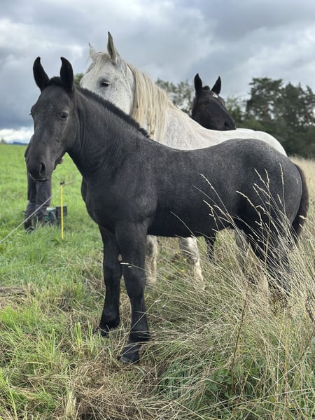 Superbe poulain pp percheron Manipulé depuis sa naissance Monte en van et camion Licole À été en concours modèle et allures avec sa mère et sans sa mère, se comporte toujours très bien
