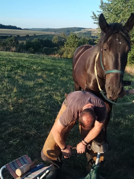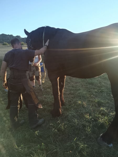 For sale is our Percheron with French papers, as we are unable to give him the time he deserves. He is kept in a herd environment, very robust and in excellent health. He is barefoot with us, well-behaved when trimmed by the farrier, and has only been shod once in his life. At the age of three, he was involved in an accident. He has been in our possession since 2017 and is used for leisure riding; he is fearless in the terrain. Eliot is a dominant member of the herd but is very social and well-behaved with other horses under saddle, even with unfamiliar ones. In terms of character, he is affectionate, people-oriented, and eager to work, but he is not suitable for beginners.