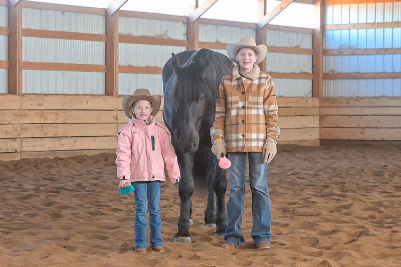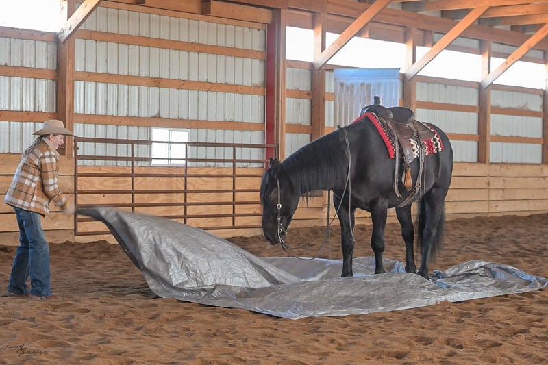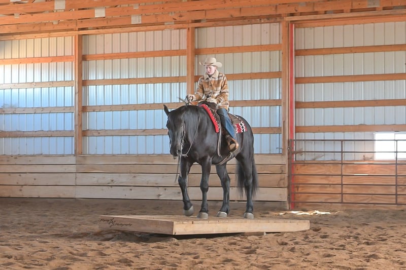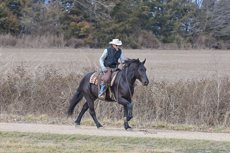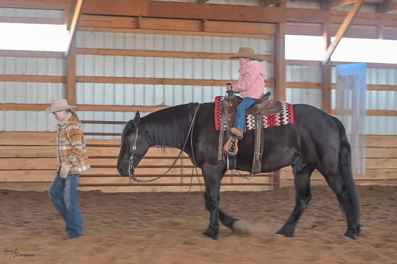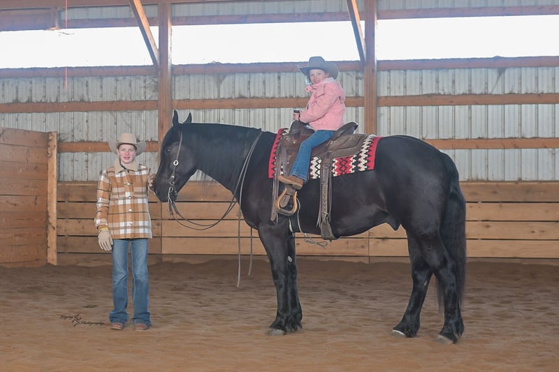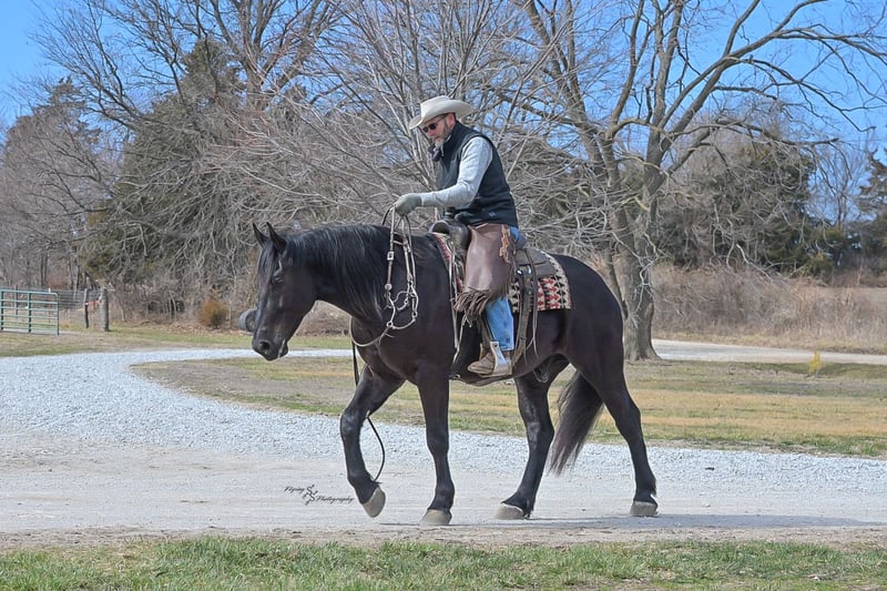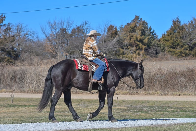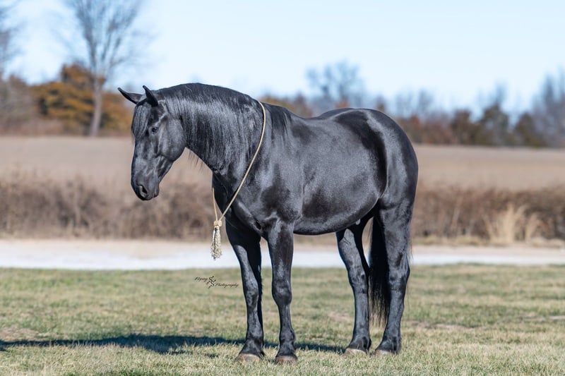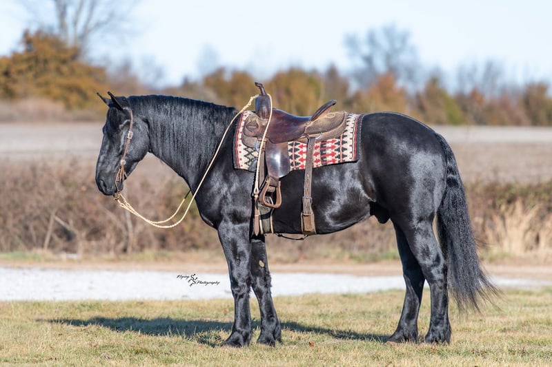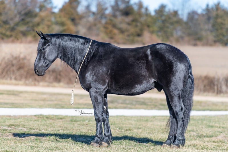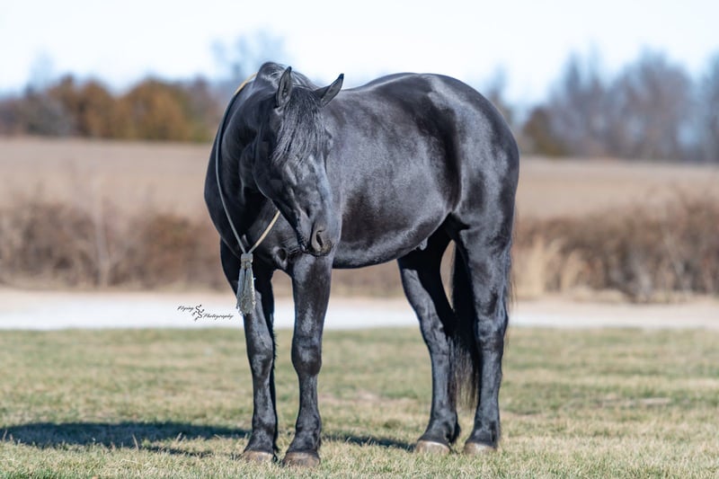 ⚜️𝓽𝓱𝓮 𝐆𝐎𝐋𝐃 𝓢𝓮𝓵𝓮𝓬𝓽⚜️ Happening now thru MONDAY | MARCH 23rd - Available EXCLUSIVELY on HorseBid's website! For more details and to register visit: www.Horsebid.com CONSIGNOR CONTACT: Yoder Family Horses 417-432-1088 LOCATION: Harwood, MO BREED: Percheron x Quarter Horse Crossbred REGISTERED: No REGISTERED NAME: Raven COLOR: Black HEIGHT: 16 AGE: 4 GENDER: Gelding Meet Raven; an exceptionally well-trained crossbred gelding that is a real pleasure to saddle up and ride! Raven is a 2022 model Percheron x Quarter Horse gelding that stands 16h and wears a #4 shoe. He is a true gentle giant that always loves attention, being groomed, saddled and ridden. He has been on our farm approximately one year and has been used for various farm work under harness as a team with other draft horses. Plus, he has been in steady training in our program as a saddle horse for a full year. Raven rides around handier than most crossbreds with a smooth collected trot and lope. He has a nice, steady ground covering walk that is perfect for riding the trails. He lopes even circles, correctly picking up his leads on cue, and has a fantastic stop for a crossbred. Raven is a horse that the entire family can truly enjoy. He has been ridden by complete beginners, young children, and trainers; he gets along with everyone! Raven enjoys trail obstacles and is very confident, steady and surefooted, no matter what you encounter on the trails. If you like a horse that wants to be your buddy each and every day, here he is! He is respectfully in your pocket. Raven is always super easy to catch and has perfect ground manners. He stands patiently to groom, tack, bathe and shoe. He also stands at the mounting block to be mounted or dismounted. He doesn't mind standing tied for hours and loads willingly in a trailer. Raven has always been perfectly sound and healthy; and has no scars, blemishes, or bad habits. He sells 100% sound in every way and even comes with a current Pre-Purchase exam. If you have any questions or would like to meet Raven prior to the auction ending, please CALL us at 417-432-1088.