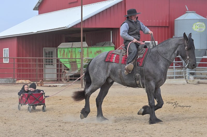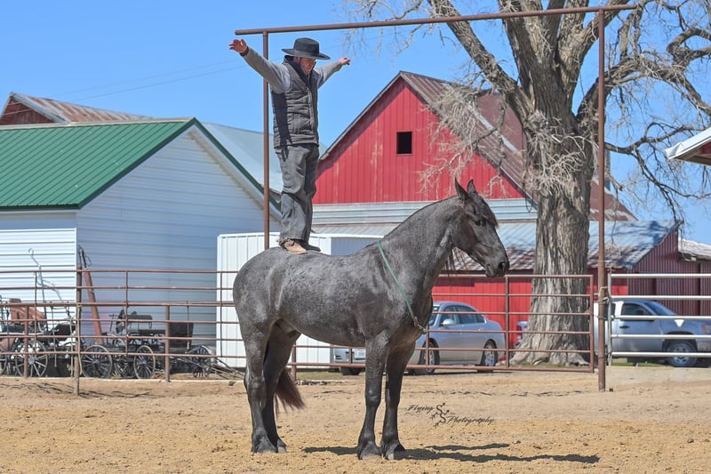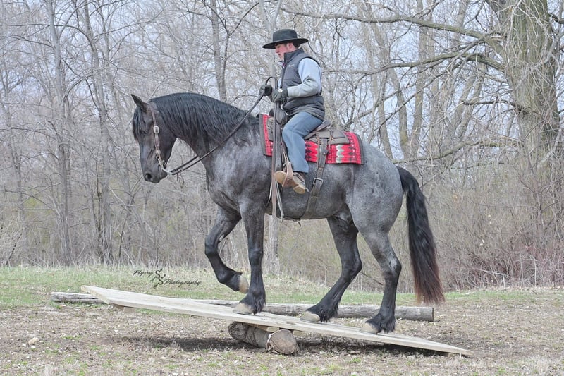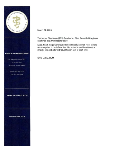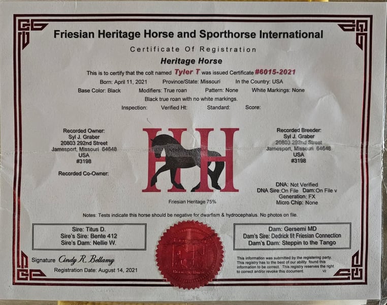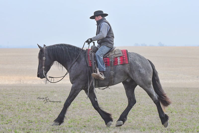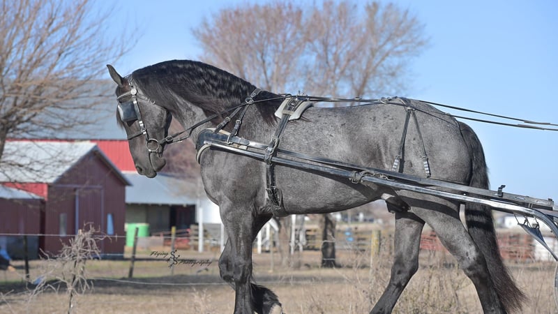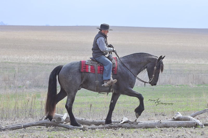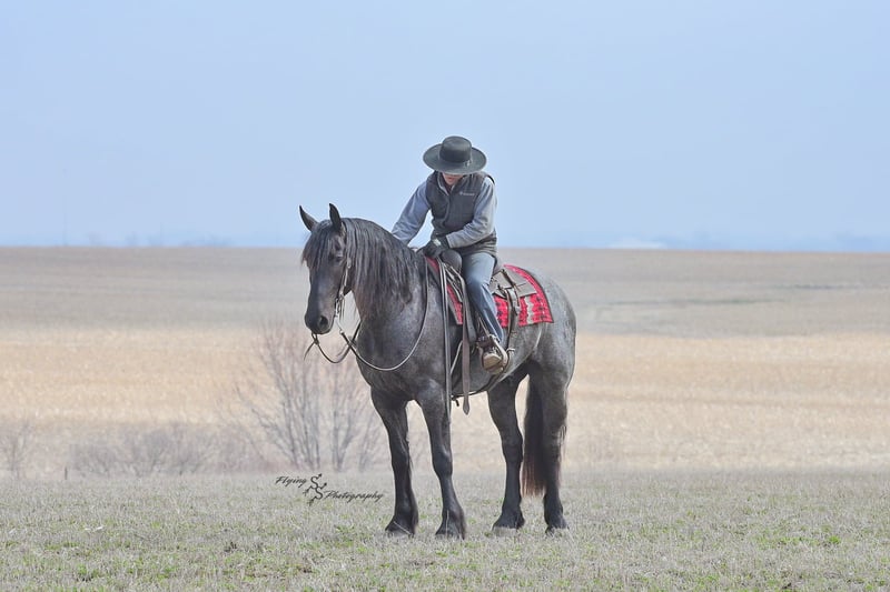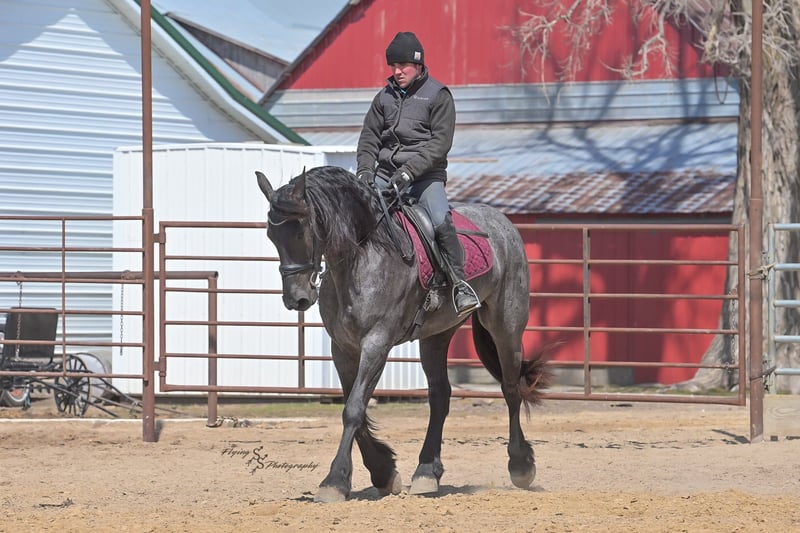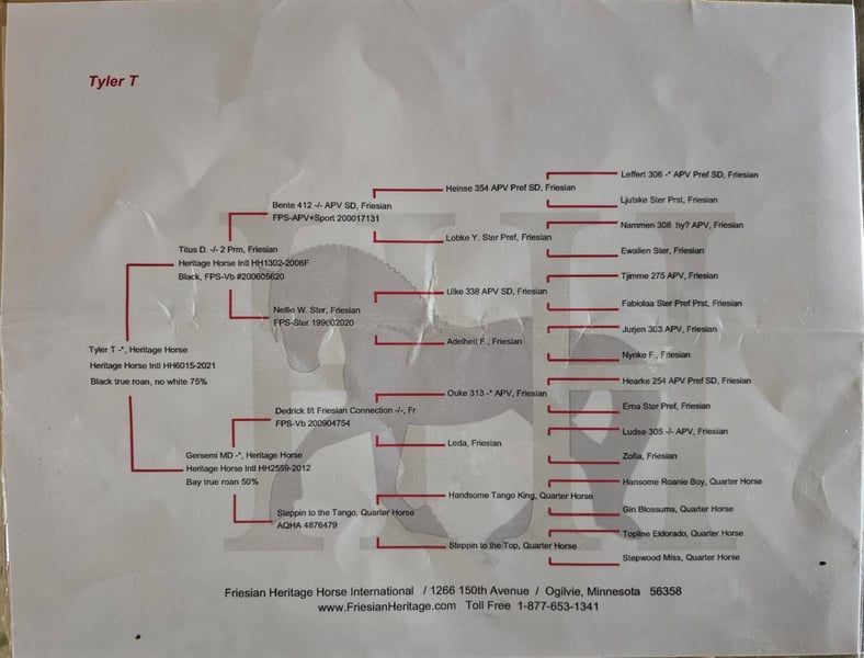 ONLINE AUCTION Place your bids at www.PlatinumEquineAuction.com Starting Bid $3500 Auction ends July 13th 2025 Need a new saddle? Check out White Rock Saddles on our website or Facebook! A. Tyler T. is a true blue roan, 16h, registered Friesian Heritage and Sporthorse International gelding. He has the color, class, and conformation; this nice young gelding checks every box. He is 16h, 75% Friesian and 25% Quarter Horse which has packed him with athleticism as well as elegance. Tyler has had a lot of versatility in his training. He rides western, English, bareback, bridleless, and drives! His riding, disposition, and overall maturity are out of this world for his age. Tyler takes pressure extremely well, especially for only being 4 years old. He has such a solid foundation. Tyler enjoys working in the arena, as well as spending time out on the trails and going through the obstacle course. He is very quiet on the trails and has been exposed to wildlife, downed timber and water. He is traffic safe when riding or driving and has even been to the parks in town! If you’re searching for a young, fancy gelding with the drive to be a performance horse backed by the disposition to be an in your pocket, best friend…. Tyler is who you need in your barn. He is comfortable around small children. We have led him with the kids in the saddle and even turned him loose with the youngsters in a controlled environment. Tyler also does well around other horses, livestock, and small pets, nothing phases him. He does wonderful in a stall or in a pasture setting and is easy to catch. Anyone with riding experience will get along well with him. Tyler is an honest individual! He lopes beautiful, correct circles, picking up his leads on cue. Tyler also has a very nice extended trot! He is a horse that is happy to work for you and truly aims to please. In the arena, Tyler is showing a lot of natural ability in dressage. He has the power and class to excel in that discipline. Tyler also looks beautiful and performs well in western tack! He also looks like royalty when hitched to a carriage. At such a young age, and with the foundation of training that he has had, the sky’s the limit for him. Tyler stands at a mounting block to be mounted and stands cross tied to be tacked up. He is an absolute gentleman for the veterinarian and farrier. Tyler is extremely gentle on the ground and loves attention, making him easy to handle. I have no complaints about this excellent gelding, and have no doubt that whoever buys him, will love him. He will come with a PPE on file and current coggins. If you would like radiographs, I am happy to assist with that. If you would like to meet Tyler or have any questions prior to the auction ending, please call Edwin Raber 319-283-0616. Located in Fairbank, IA, we invite anyone to come see him in person and spend some time with us! ONLINE AUCTION Place your bids at www.PlatinumEquineAuction.com Starting Bid $3500 Auction ends July 13th 2025 Need a new saddle? Check out White Rock Saddles on our website or Facebook!