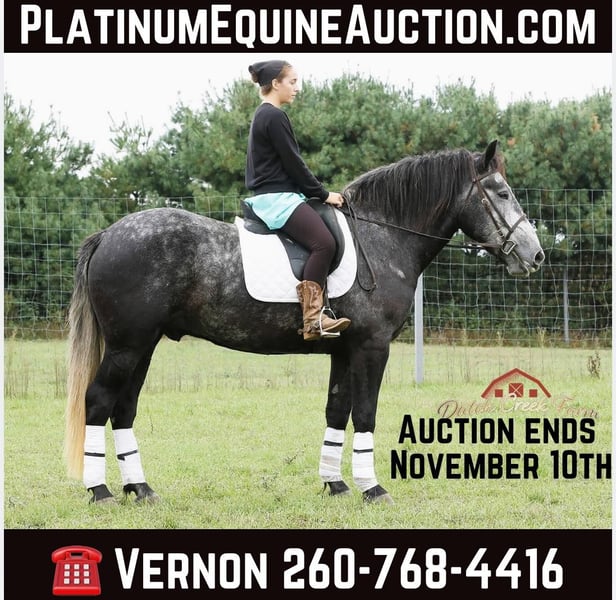 ONLINE AUCTION Place your bids at www.PlatinumEquineAuction.com Starting Bid $3500 Auction ends November 10th, 2024 Need a new saddle? Check out White Rock Saddles on our website or Facebook! Check out this guy!!! Mojo comes by his name honest as he has got the MOJO! He is a coming 5 year old, Dapple Grey Draftcross Gelding, standing 15.2h and he is weighing aroun 1350lbs. Mojo is very well trained to drive and ride. He has been in our tour wagons all summer and has hauled numerous guest. He is not phased by any of our exotics and stands patiently at all stops. He will also drive single in a carriage for an enjoyable afternoon drive. Mojo is also great under saddle! He picks up the correct leads, lopes nice soft easy circles, moves off of leg pressure, neckreins and backs. He is great on trails, he will cross creeks, ditches, deadfall and scales steep slopes. Mojo will ride western or english either one. He has been ridden by all levels of riders and takes care and respects them all. He will ride out alone or in a group either one. He is the safe horse whether ridden daily or even if you leave him off for 3 months. Mojo can go in any direction from foxhunting, to jumping, to ranch work to trails… you name it and he can do it!! We’d love to talk with you about Mojo or set up a time for you to come meet him in person. We are located in Shipshewana, IN. Contact Dutch Creek Farm Vernon 260-768-4416 with any questions. ONLINE AUCTION Place your bids at www.PlatinumEquineAuction.com Starting Bid $3500 Auction ends November 10th, 2024 Need a new saddle? Check out White Rock Saddles on our website or Facebook!
