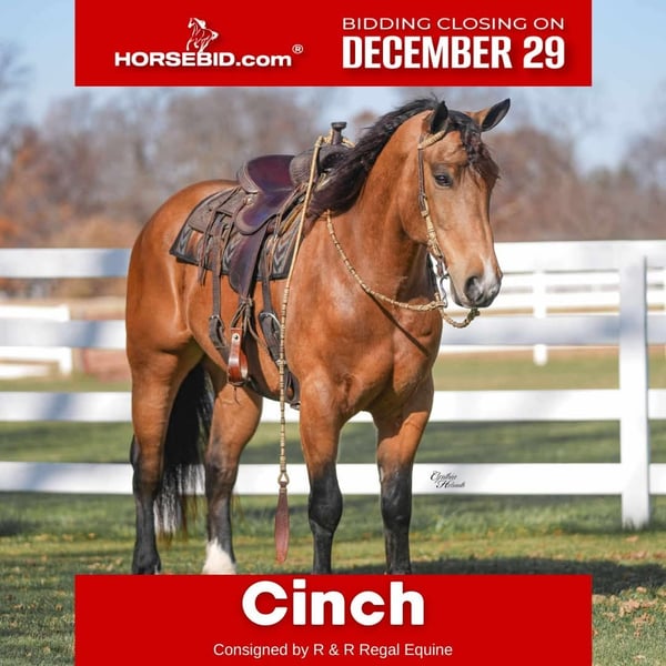 ⚜️ 𝓗𝓮𝓻𝓲𝓽𝓪𝓰𝓮 𝐖𝐢𝐧𝐭𝐞𝐫 𝓒𝓵𝓪𝓼𝓼𝓲𝓬⚜️ Happening now thru MONDAY | DECEMBER 29th - Available EXCLUSIVELY on HorseBid's website! For more details and to register visit: www.Horsebid.com CONSIGNOR CONTACT: R & R Regal Equine 319-334-8649 LOCATION: Independence IA BREED: Percheron/quarter horse cross REGISTERED: No COLOR: Buckskin HEIGHT: 16 AGE: 5 GENDER: Gelding 🔥 Cinch – 5-Year-Old Buckskin Crossbred Gelding • 16 Hands • Rides & Drives! 🔥 Introducing Cinch, a stunning 5-year-old buckskin crossbred gelding standing a solid 16 hands. This gelding is the total package—good-minded, versatile, and beautifully broke in and out of the arena. Cinch rides English and Western with equal ease. He has three comfortable, balanced gaits and takes both contact and a loose rein willingly. Whether you want a partner for flatwork, ranch riding, or just enjoyable pleasure miles, he’s ready to go. He also drives and does well in traffic, making him an excellent candidate for someone wanting a dependable all-around horse. On the trail, Cinch is confident and sure-footed—happy to lead, follow, or ride in a group. He’s seen a variety of terrain and handles new environments with a steady, sensible attitude. Cinch is the kind that turns heads everywhere he goes and has the demeanor to match. Suitable for riders who want a handsome, capable, and versatile gelding to enjoy for years to come.