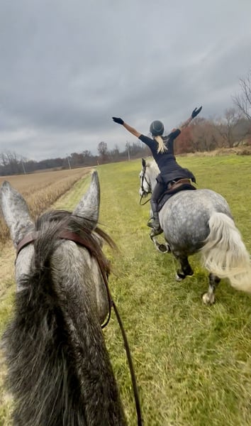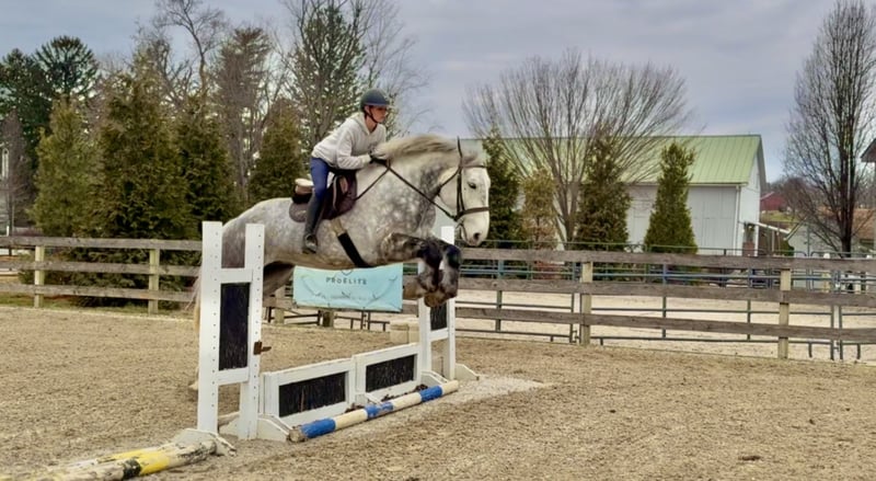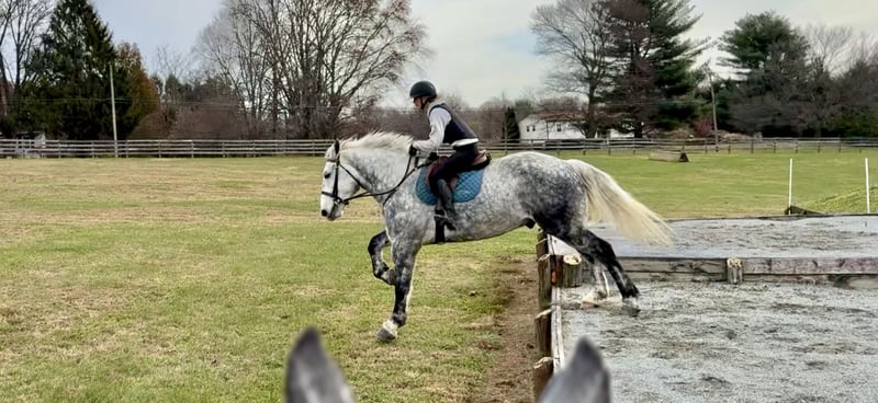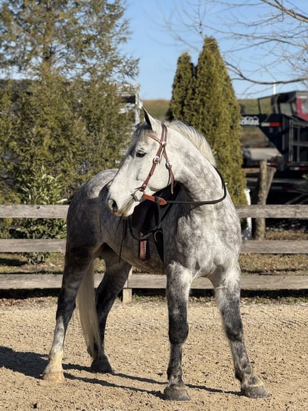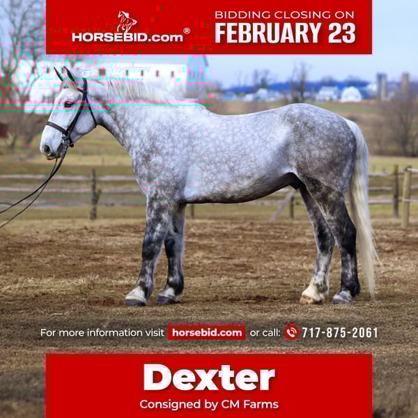 💎 𝐓𝐇𝐄 𝓓𝓲𝓪𝓶𝓸𝓷𝓭 𝐒𝐇𝐎𝐖𝐂𝐀𝐒𝐄 💎 Happening now thru MONDAY | FEBRUARY 23rd - Available EXCLUSIVELY on HorseBid's website! For more details and to register visit: www.Horsebid.com CONSIGNOR CONTACT: CM Farms 717-875-2061 LOCATION: Gap, PA BREED: Perch/QHx REGISTERED: No REGISTERED NAME: Dexter COLOR: Dapple Grey HEIGHT: 16.3-17 AGE: 6 GENDER: Gelding Meet ✨Dexter✨! This big boy is a 6-year-old, 16.3–17hh PerchX gelding. He is incredibly eye-catching, covered in dapples with a long, flowing tail that reaches the ground. He always wears the sweetest expression! He’s broke to ride Western and English and has also been started in harness. This handsome boy will make someone an incredibly fun and versatile partner. Under saddle, Dexter has a solid walk, trot, and canter in both directions in the arena. He’s sturdy, sensible, and well-balanced. He’s an easy horse to ride—right in the perfect in-between of whoa and go—and he’s responsive to both seat and voice aids. For a bigger build, he carries himself very well and shows surprising athleticism over fences. He’ll happily pop over crossrails and solid fences, and he has schooled up to 2’6” with scope for more. He’s also been cross-country schooling and never hesitated at a thing—he even handled the ditch combination beautifully without batting an eye. On the trail, Dexter has plenty of miles and truly enjoys being out. He keeps his steady demeanor and is happy to go anywhere you put him in the group. He gets along well with other horses and doesn’t mind if one rides up a little close. He’s been trailered out to several local trail systems and always behaves perfectly. He also went to multiple hunter paces this fall and jumped everything confidently. He would be a fun one to take out fox hunting. He’ll cross water, navigate tight wooded paths, and lope across open fields—he’s simply a fun, enjoyable partner to ride. He’ll even lay down to get on and off! Dexter had one home before coming to us, and understandably took some time to settle into our barn. He can be nervous on the ground, but he never acts out or becomes naughty—he just needs someone patient to give him reassurance, hold his hand, and help build his confidence. He truly bonds with “his person,” and he’s funny in that he relaxes the moment you get on his back; it’s like his worries melt away under saddle. The world can feel big and scary for him, and we don’t hold that against him. He stands in crossties or a straight tie for grooming and tacking. In true draft fashion, he needs continued work with picking up his feet and currently requires stocks for shoeing. We are continuing to work on this until he leaves our care, and he’s already made leaps and bounds of progress. While he is likely suitable for a beginner rider in the saddle, he should go to someone with at least some experience to help guide him on the ground and continue building his confidence. Dexter is a genuinely incredible young horse with a bright future, and we’re committed to finding him the great home he deserves.