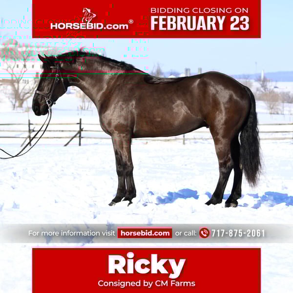 💎 𝐓𝐇𝐄 𝓓𝓲𝓪𝓶𝓸𝓷𝓭 𝐒𝐇𝐎𝐖𝐂𝐀𝐒𝐄 💎 Happening now thru MONDAY | FEBRUARY 23rd - Available EXCLUSIVELY on HorseBid's website! For more details and to register visit: www.Horsebid.com CONSIGNOR CONTACT: CM Farms 717-875-2061 LOCATION: Gap, PA BREED: Perch/Friesian REGISTERED: No REGISTERED NAME: Ricky COLOR: Black HEIGHT: 17.1 AGE: 6 GENDER: Gelding Meet ✨Ricky!✨ This guy is the definition of tall, dark, and handsome! Ricky is a 6-year-old Percheron/Friesian cross gelding standing an impressive 17.1–17.2 hands. He’s built correctly and substantially — you can’t miss this breathtaking boy! He’s like the semi-truck of the horse world, without the dinner-plate feet. He’s broke to ride Western, English, and bareback — and YES, he’s comfy as a couch! Ricky is a true gentle giant with a soft eye and an equally sweet personality. ❤️ In the ring, Ricky will walk, trot, and canter both ways. He’s been brought along slowly, carefully, and correctly, making him simple, straightforward, and easy to ride. This gelding has stunning, ground-covering movement that makes you feel like you’re gliding through the air. He has a soft feel in the hand and is very light on his feet for such a big guy. His trot is extremely comfortable and easy to sit, and he’s learning to collect and extend. His favorite speed is probably slow — he’s definitely a push ride and will never go faster than you ask. His canter continues to improve, with balanced transitions and consistent leads. While he appreciates encouragement to stay forward, he is always willing and eager to please. He stops on a dime off a “whoa” or simply your seat. He’s been lightly started over jumps and is showing nice potential. Overall, Ricky is an extremely quiet and safe ride — one you’ll look forward to pulling out every time. He’d be suitable for an AA, or even a beginner working with a trainer. 🤩 On the trail, Ricky is that steady-eddy type everyone wants. He’d make a fantastic husband or guest packer! He’s happy to lead or follow and doesn’t mind another horse getting into his personal space. You can ride him on the buckle, and he’ll mosey along wherever you point him. He has excellent manners out and the very best brain. He’s been on many trail rides with us, and we’ve even ridden him into town. Traffic and semi trucks don’t faze him at all. Ricky is the go-to guy for a relaxing ride — crack a beer, sit back, and let the worries melt away. He’ll go through water, canter open fields, or bushwhack through thick forest. He’s truly a point-and-go ride you can depend on to get everyone back to the barn safely. He really enjoys going out, and we could easily see him excelling as a trail partner or in fox hunting, paper chases, and hunter paces. ✨ In the barn, Ricky is well-mannered and respectful. He stands quietly on the ties for grooming, tacking, bathing, clipping, or simply being fussed over for hours. He enjoys attention and loves his people. He has a calm, quiet personality and respects your space — though he’ll be happily in-your-pocket once the cookies come out! 😆 He has zero bad stall or turnout habits and gets along well with others. Ricky is currently barefoot with nice, solid feet and is always well behaved for the farrier. He loads easily on the trailer and maintains his same quiet, steady demeanor both on and off property. Ricky lunges, does groundwork, and has completed our desensitization program with flying colors. He’s a true gentleman, and once he realizes you’re his person, you’ll have a best friend for life. We’re excited to see Ricky’s future and want only the very best home for this gentle giant. ❤️ Ricky is sound, healthy, and has zero vices. He is UTD on shots, deworming, Coggins, dental, and farrier care.