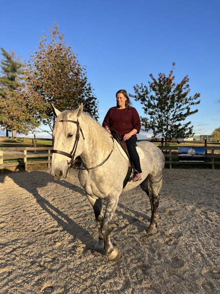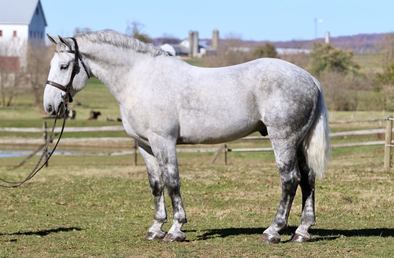 ⚜️ 𝓽𝓱𝓮 𝐇𝐨𝐫𝐬𝐞𝐦𝐚𝐧'𝐬 𝓢𝓱𝓸𝔀𝓬𝓪𝓼𝓮⚜️ Happening now thru MONDAY | DECEMBER 1st - Available EXCLUSIVELY on HorseBid's website! For more details and to register visit: www.Horsebid.com CONSIGNOR CONTACT: CM Farms 717-875-2061 LOCATION: Gap, PA BREED: Perch/QH REGISTERED: No COLOR: Grey HEIGHT: 17 AGE: 7 GENDER: Gelding Here’s the highlight of our year — meet Silver! The ultimate guest horse! This breathtaking horse is a 7-year-old Percheron/QHx gelding standing a sturdy 17hh. Silver was put together right — he’s got curves in all the right places, he is quite substantial, making him great for a variety of different riders, and his brain is simply unbeatable! He is broke to ride Western, English, bareback, and broke to drive single or double. He will lay down on command to mount or dismount! Although Silver is a big boy in every way, he is able to be athletic and has one of the cutest jumps in the barn. This guy has blown us away with not only his beauty, but his quiet, unfaltering mind, and we can guarantee he will do the same wherever he goes! Under saddle, Silver is hands-down one of the most fun and safe horses to ride! He’s so incredible — we have even ridden him bridleless at the walk, trot, and canter. He’s well educated with walk-to-canter transitions, he neck reins and direct reins, he moves off of leg, and he’s adjustable at all three gaits. His trot and canter are some of the most comfortable we’ve ever ridden — incredibly easy to sit — and at the canter he will make you feel like you’re on top of the world! He responds well to voice cues and will stop on a dime with just a “whoa” or by sitting back. He is fun for any level of rider because he does not get upset if you make a mistake or flop around, and he has enough buttons to keep things fun for someone more advanced. He is more of a push ride, and you can have plenty of leg on him; however, he’s always responsive when you ask him to go and will carry himself very well. This guy is so well balanced, steady, and willing to please. He is even able to canter little circles in both directions and leg-yield at all three gaits. He’s one you could take into the dressage ring tomorrow, and we don’t doubt he’d clean up the ribbons. On the trail, Silver keeps the same steady mentality. He’ll pack anyone you put on him with reliability, a sure foot, and a happy attitude. He’s the same horse off property as he is at home- and he’s the same horse EVERY time you pull him out. This handsome man has been everywhere — from cantering through open fields, going up and down windy wooded trails, through creeks, over bridges, and through tunnels — he’s even ridden right into town and through the drive-thru! You can take him to the grocery store, tie him up while you shop, and come back out to find him waiting patiently. He is unflappable, sturdy, and will lead, follow, or go anywhere you put him in the group. He doesn’t mind if another horse rides too close to him and seems to get along with everyone. Silver has been out on multiple hunter paces with us this past fall, and he would make an incredible candidate for fox hunting. This gelding is extremely honest to all the jumps, whether it be logs, coops, or even the silly inflatable kinds — point him in the right direction, and he will take care of everything else. He has also been cross-country schooling with us and proved himself to be extremely athletic and cute with his form and knees. He did the ditch combination with no hesitation — and if you are familiar with how difficult that is for some horses, that says a lot in itself! He is so big that when he takes a larger jump it feels like you’re popping over a crossrail. He’s jumped some sizable 3’–3’3” coops and could likely even do bigger! This guy will give you a feel like you’re floating on air, and his confidence truly will make anyone a better rider! In the barn, Silver is really just an oversized puppy dog. He loves people, loves being brushed, and loves getting any type of attention! Most importantly, he has good manners in his stall, to tack up, and on the ground. This giant love bug is the type of horse that will meet you in the pasture when he sees you coming- and is always happy to spend quality time with his person. Once you’re done riding him, he will follow you anywhere like a puppy — no lead rope required! He loads right into the trailer, gets along with everyone, and is genuinely such a fun horse to have in the barn. Staying true to his typical draft nature, the one area Silver could still use some work on is picking up his feet. Our farrier has used stocks with him, because it's easier on his back; however, even he said Silver has one of the best temperaments, and with just a couple more sessions and some practice, he wouldn’t need them anymore. This is something we are continuing to work on until he leaves. Special ones of his size, athletic ability, and incredible temperament do not come around very often — he is truly a once-in-a-lifetime type of horse. We have all fallen in love with him at our barn and cannot say enough good things about him. He will be your best friend, and the kind of partner you’ll never EVER be able replace.