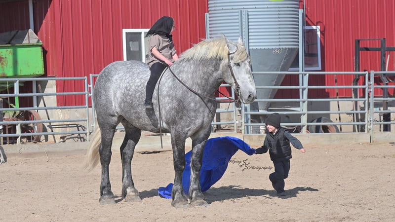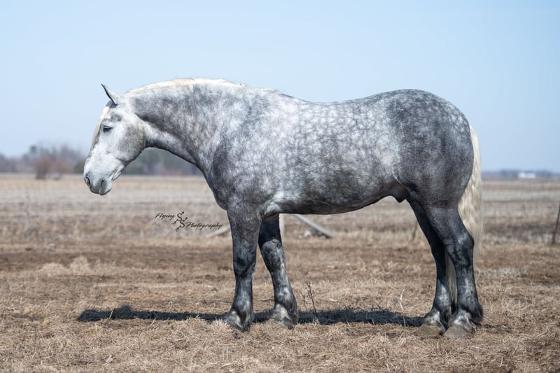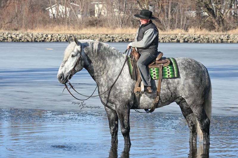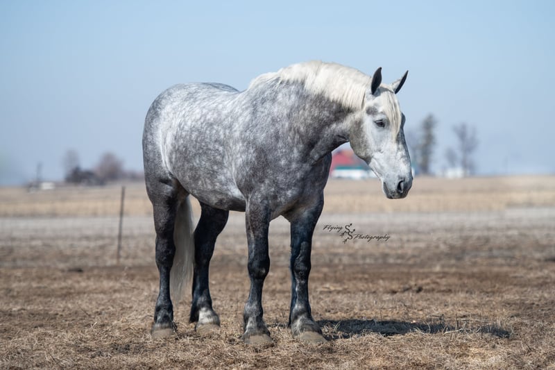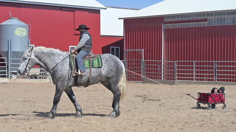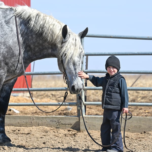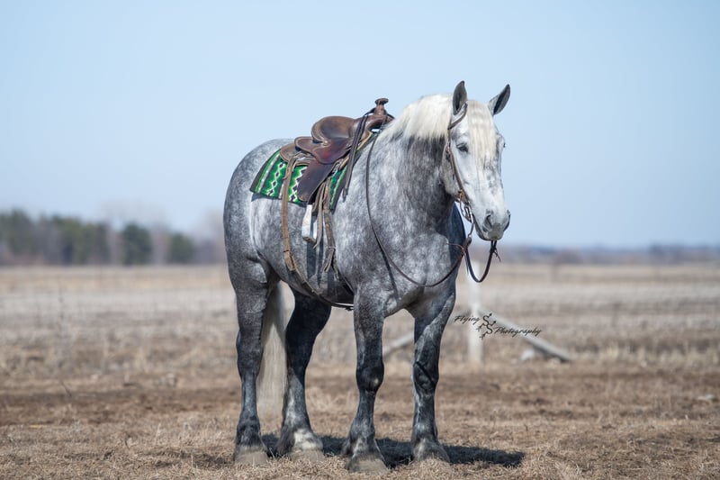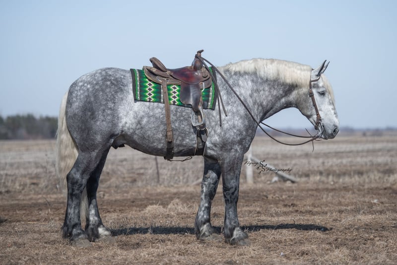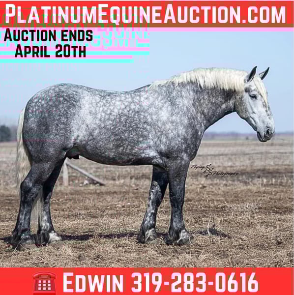 ONLINE AUCTION Place your bids at www.PlatinumEquineAuction.com Starting Bid $3500 Auction ends April 20th, 2025 Need a new saddle? Check out White Rock Saddles on our website or Facebook! Winston is a handsome dapple gray, 6 year old, registered percheron gelding. Our favorite thing about Winston is that he is incredibly safe. The phrase “Safety First” could quite literally be used as his slogan. Winston is a gentle giant, standing a staggering 18.1h tall! He will happily stand at a mounting block, or let you mount from a fence. Do not let Winson’s size intimidate you, he is a joy to handle, even for children! He is a blast to take out on the trails, easily stepping over down timber, crossing water, and going whatever direction you point him in. Winston is perfect for riders of any age and any level of experience. He is very honest on the ground as well as under saddle, admirably taking care of his rider, allowing you to place all of your trust in him. Winston rides western and bareback, bridled and bridleless, and is as comfortable under harness as he is under saddle. He drives absolute best and is incredibly safe, even for beginners or kids. Winston is easy to catch, saddle, bridle, bathe, shoe (easily picks up all 4 feet), and groom. He does great in a stall, as well as in a pasture with other horses. He rides around in an open field just as honest as he does in an arena. He is absolutely traffic safe, and is unphased by anything you will see riding down main street or a highway on a busy evening. Winston will lope in the correct lead, has a nice stop, stands quietly when cracking a bull whip or shooting a pistol, will walk through all of the obstacles, and stays solid even with time off. He is a great fit for the whole family. Winston is even loved by the farm dogs, who he will also allow to ride him! It is impossible to list everything we love about this gentle giant because the list is endless. He is truly a once in a lifetime gelding that we are proud to offer! Winston is current on Coggins, and also has a PPE on file. If you have any questions, or would like to meet him prior to the auction ending, please call Edwin Raber at 319-283-0616. Located in Fairbank, Iowa ONLINE AUCTION Place your bids at www.PlatinumEquineAuction.com Starting Bid $3500 Auction ends April 20th, 2025 Need a new saddle? Check out White Rock Saddles on our website or Facebook!