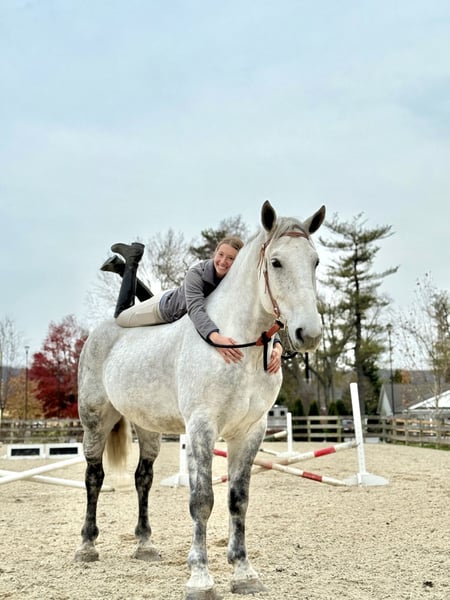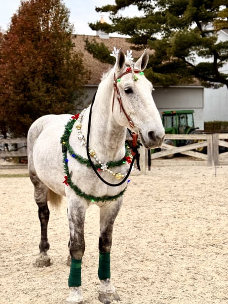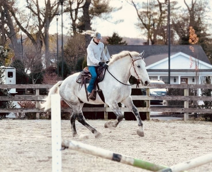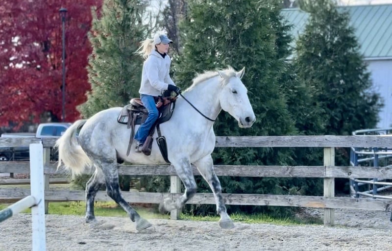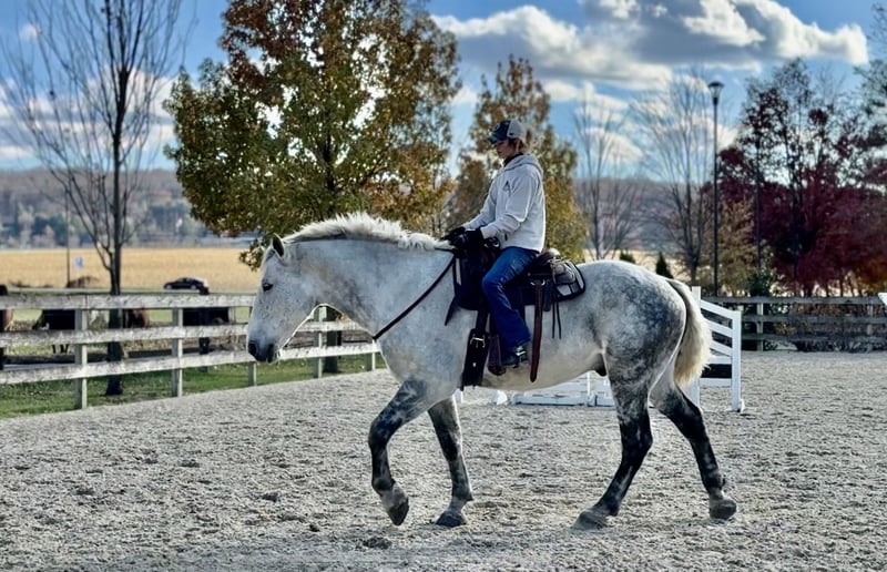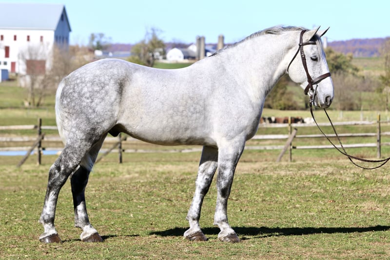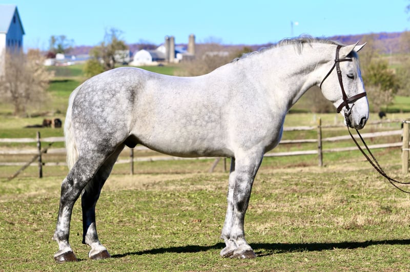 ⚜️ 𝓽𝓱𝓮 𝐇𝐨𝐫𝐬𝐞𝐦𝐚𝐧'𝐬 𝓢𝓱𝓸𝔀𝓬𝓪𝓼𝓮⚜️ Happening now thru MONDAY | DECEMBER 1st - Available EXCLUSIVELY on HorseBid's website! For more details and to register visit: www.Horsebid.com CONSIGNOR CONTACT: CM Farms 717-875-2061 LOCATION: Gap, PA BREED: Perch/QH REGISTERED: No COLOR: Grey HEIGHT: 17 AGE: 7 GENDER: Gelding Here’s the highlight of our year — meet Silver! The ultimate guest horse! This breathtaking horse is a 7-year-old Percheron/QHx gelding standing a sturdy 17hh. Silver was put together right — he’s got curves in all the right places, he is quite substantial, making him great for a variety of different riders, and his brain is simply unbeatable! He is broke to ride Western, English, bareback, and broke to drive single or double. He will lay down on command to mount or dismount! Although Silver is a big boy in every way, he is able to be athletic and has one of the cutest jumps in the barn. This guy has blown us away with not only his beauty, but his quiet, unfaltering mind, and we can guarantee he will do the same wherever he goes! Under saddle, Silver is hands-down one of the most fun and safe horses to ride! He’s so incredible — we have even ridden him bridleless at the walk, trot, and canter. He’s well educated with walk-to-canter transitions, he neck reins and direct reins, he moves off of leg, and he’s adjustable at all three gaits. His trot and canter are some of the most comfortable we’ve ever ridden — incredibly easy to sit — and at the canter he will make you feel like you’re on top of the world! He responds well to voice cues and will stop on a dime with just a “whoa” or by sitting back. He is fun for any level of rider because he does not get upset if you make a mistake or flop around, and he has enough buttons to keep things fun for someone more advanced. He is more of a push ride, and you can have plenty of leg on him; however, he’s always responsive when you ask him to go and will carry himself very well. This guy is so well balanced, steady, and willing to please. He is even able to canter little circles in both directions and leg-yield at all three gaits. He’s one you could take into the dressage ring tomorrow, and we don’t doubt he’d clean up the ribbons. On the trail, Silver keeps the same steady mentality. He’ll pack anyone you put on him with reliability, a sure foot, and a happy attitude. He’s the same horse off property as he is at home- and he’s the same horse EVERY time you pull him out. This handsome man has been everywhere — from cantering through open fields, going up and down windy wooded trails, through creeks, over bridges, and through tunnels — he’s even ridden right into town and through the drive-thru! You can take him to the grocery store, tie him up while you shop, and come back out to find him waiting patiently. He is unflappable, sturdy, and will lead, follow, or go anywhere you put him in the group. He doesn’t mind if another horse rides too close to him and seems to get along with everyone. Silver has been out on multiple hunter paces with us this past fall, and he would make an incredible candidate for fox hunting. This gelding is extremely honest to all the jumps, whether it be logs, coops, or even the silly inflatable kinds — point him in the right direction, and he will take care of everything else. He has also been cross-country schooling with us and proved himself to be extremely athletic and cute with his form and knees. He did the ditch combination with no hesitation — and if you are familiar with how difficult that is for some horses, that says a lot in itself! He is so big that when he takes a larger jump it feels like you’re popping over a crossrail. He’s jumped some sizable 3’–3’3” coops and could likely even do bigger! This guy will give you a feel like you’re floating on air, and his confidence truly will make anyone a better rider! In the barn, Silver is really just an oversized puppy dog. He loves people, loves being brushed, and loves getting any type of attention! Most importantly, he has good manners in his stall, to tack up, and on the ground. This giant love bug is the type of horse that will meet you in the pasture when he sees you coming- and is always happy to spend quality time with his person. Once you’re done riding him, he will follow you anywhere like a puppy — no lead rope required! He loads right into the trailer, gets along with everyone, and is genuinely such a fun horse to have in the barn. Staying true to his typical draft nature, the one area Silver could still use some work on is picking up his feet. Our farrier has used stocks with him, because it's easier on his back; however, even he said Silver has one of the best temperaments, and with just a couple more sessions and some practice, he wouldn’t need them anymore. This is something we are continuing to work on until he leaves. Special ones of his size, athletic ability, and incredible temperament do not come around very often — he is truly a once-in-a-lifetime type of horse. We have all fallen in love with him at our barn and cannot say enough good things about him. He will be your best friend, and the kind of partner you’ll never EVER be able replace.