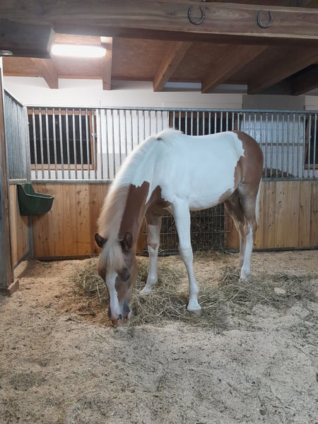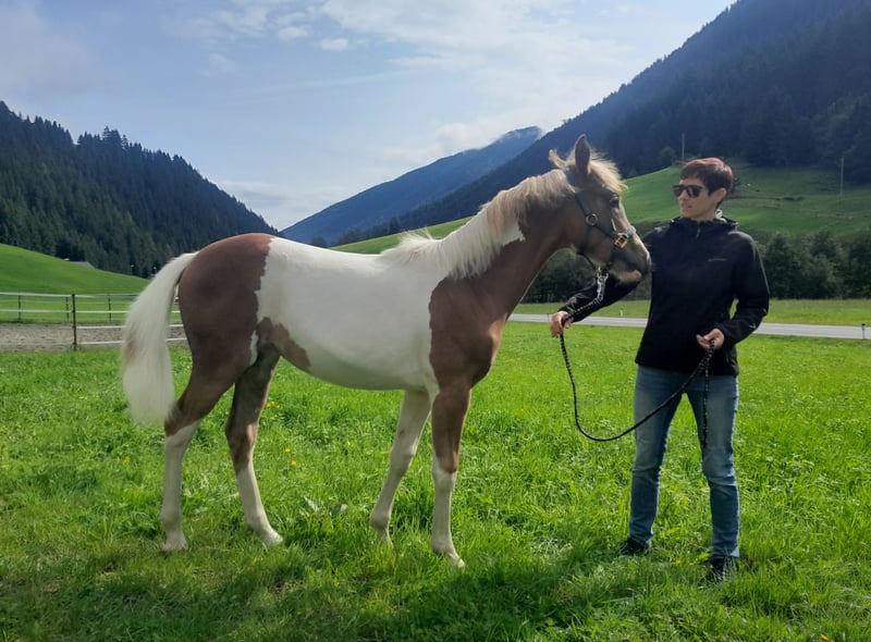 Sehr menschenbezogenes Pinto Stutfohlen in sonder Lackierung sucht ein neues Zuhause. Malou wird ca. 157 cm groß und der ideale Partner für Freizeit oder Sport. Malou stammt aus einer sehr sportlichen Haflingerstute und dem Pinto Araber Hengst Jameel (73,44 %Ox). Sie ist sehr gelehrig, anhänglich und auf Menschen bezogen.