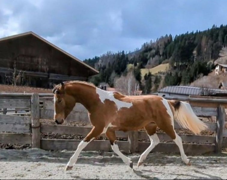 Beautifully marked Arab-Pinto cross mare For sale is a two-and-a-half-year-old mare with an exceptionally striking coat pattern. The mare is located at a riding stable in East Tyrol and has begun initial groundwork sessions (grooming, leading, lunging). She is very gentle, affectionate, brave, and very people-oriented – completely fearless with an outstanding temperament. Expected final height approximately 1.60 m (15.3 hh). A true gem for breeding, sport, and the heart!