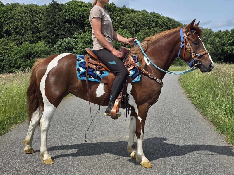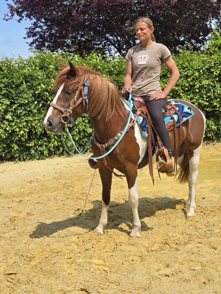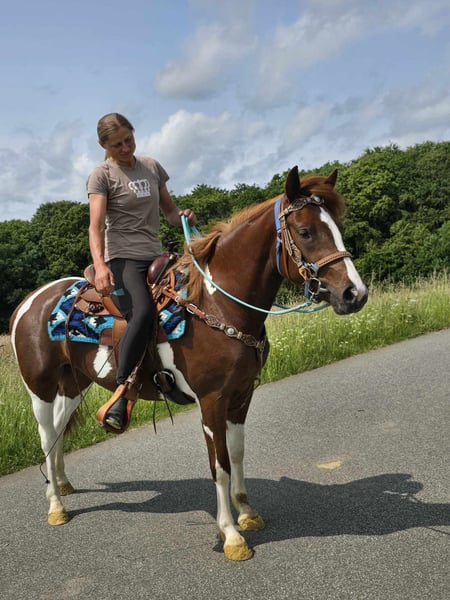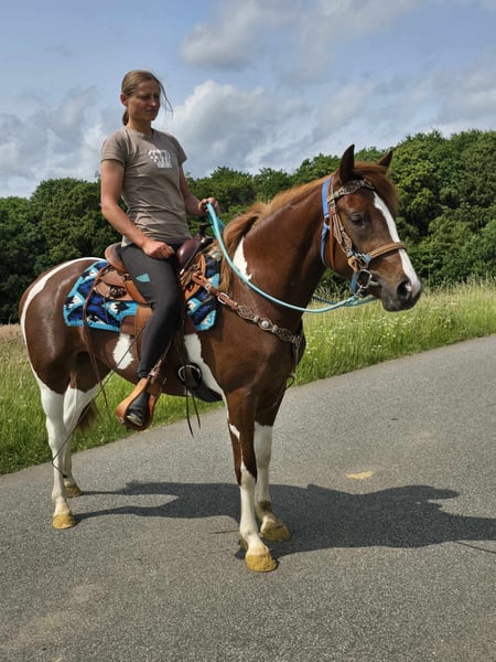 Leisure Mare "Maja" – Chestnut Pinto Mix Mare for Leisure and Trail Riding* *Age*: 3 years, started under saddle and has been driven *Height*: approx. 1.45 m *Equipment*: E-Pass, microchip, and vet check available *Price*: €4,900 *ridden and driven* A beautiful mare that is ideal for trail and leisure riding. She is a versatile leisure horse, well-suited for both English and Western riding. She has a great, balanced temperament and feels comfortable in a herd, but is also well-adjusted in a stable environment. ### *What distinguishes her:* - Used to open stable and herd living; box living is also not a problem - Ideal for leisure and trail riders - Very balanced and uncomplicated to handle *Interested?* Feel free to call us at *0171-4001968* (daily from 8 AM to 8 PM). *Please no emails or WhatsApp, only calls!* *Additional Information:* - Accessories and transport can be organized at a low cost. - Our farm shop offers a small selection of used Western saddles. - *Installment payments are not possible.* *Customer Service:* - Every customer receives a contractually guaranteed *three-month exchange right.* - A trial ride with us is possible, so you can get to know your dream horse. For €35, you can ride, have her shown to you, go for a walk, or more. If desired, you can also test a second horse for €25. This amount will, of course, be deducted from the purchase of a horse on the same day. *Special Features:* - Upon immediate pickup with a horse trailer, you will receive *a discount of €100.* - We conduct the sale with a transparent trial ride to ensure that it is the right horse for you. *Legal:* - We are the sole and unrestricted owners of the images; the image rights belong to us. *Unauthorized use of the images is prohibited.* - Please note that this is a living horse. Our information is based on the impressions of the caretaker and does not constitute guaranteed characteristics. - Advertisements will be deleted immediately once the horses are sold. *Interested?* Feel free to call us at *0171-4001968* (daily from 8 AM to 8 PM). *Please no emails or WhatsApp, only calls!*
