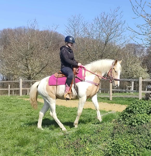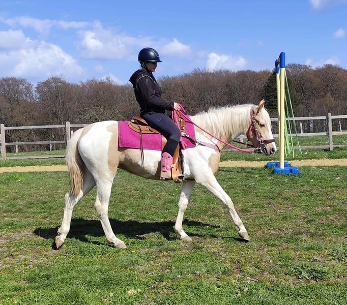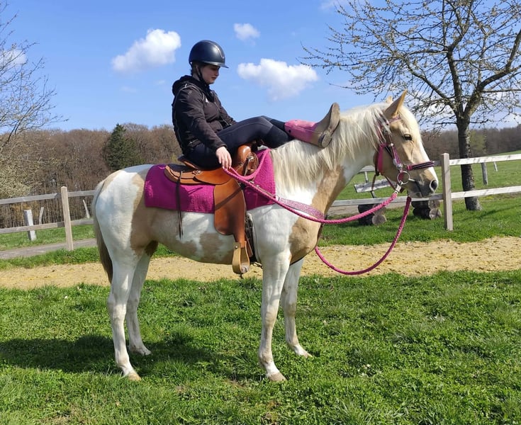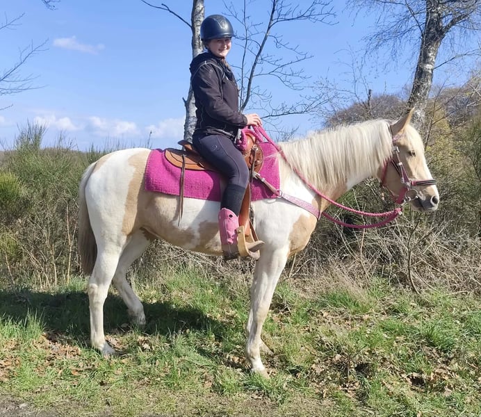 Palomino-Scheck Stute – lieb, zuverlässig & unkompliziert Name: Estrella Alter: 4 Jahre Stockmaß: ca. 1,55 m Preis:6800 AKU : Vorhanden Beschreibung: Estrella ist eine wunderschöne Palomino-Scheck Stute mit einem besonders freundlichen und ausgeglichenen Charakter. Im täglichen Umgang zeigt sie sich sehr brav, ruhig und absolut unkompliziert. Sie ist menschenbezogen, aufmerksam und lässt sich angenehm handeln. Auch unter dem Sattel überzeugt sie durch ihre Gelassenheit und Zuverlässigkeit. Estrella ist einfach zu reiten, arbeitet motiviert mit und gibt ihrem Reiter stets ein sicheres Gefühl. Für ihr junges Alter bringt sie bereits eine tolle Einstellung und viel Nervenstärke mit. Perfekt für: Reiterinnen und Reiter, die eine liebe, ehrliche und unkomplizierte Stute suchen – ideal für Freizeit, Ausritte und weitere Förderung. Pflege & Betreuung: – Regelmäßig entwurmt – Schmied gepflegt – Osteopathisch betreut Zusatzangebote: Westernsättel, Trensen und weiteres Zubehör erhältlich. Service: – Transport kann organisiert werden – 3 Monate Umtauschrecht Proberitt: – 35 € (jedes weitere Pferd 25 €) – Wird beim Kauf am selben Tag angerechnet Preisnachlass bei sofortiger Mitnahme oder Transport am gleichen Tag: – Kategorie 1: 100 € – Kategorie 2 (ab 5.000 €): 250 € Telefon: 0171 – 4001968 Täglich erreichbar von 8–20 Uhr Keine E-Mail oder WhatsApp Alle Angaben ohne Gewähr
